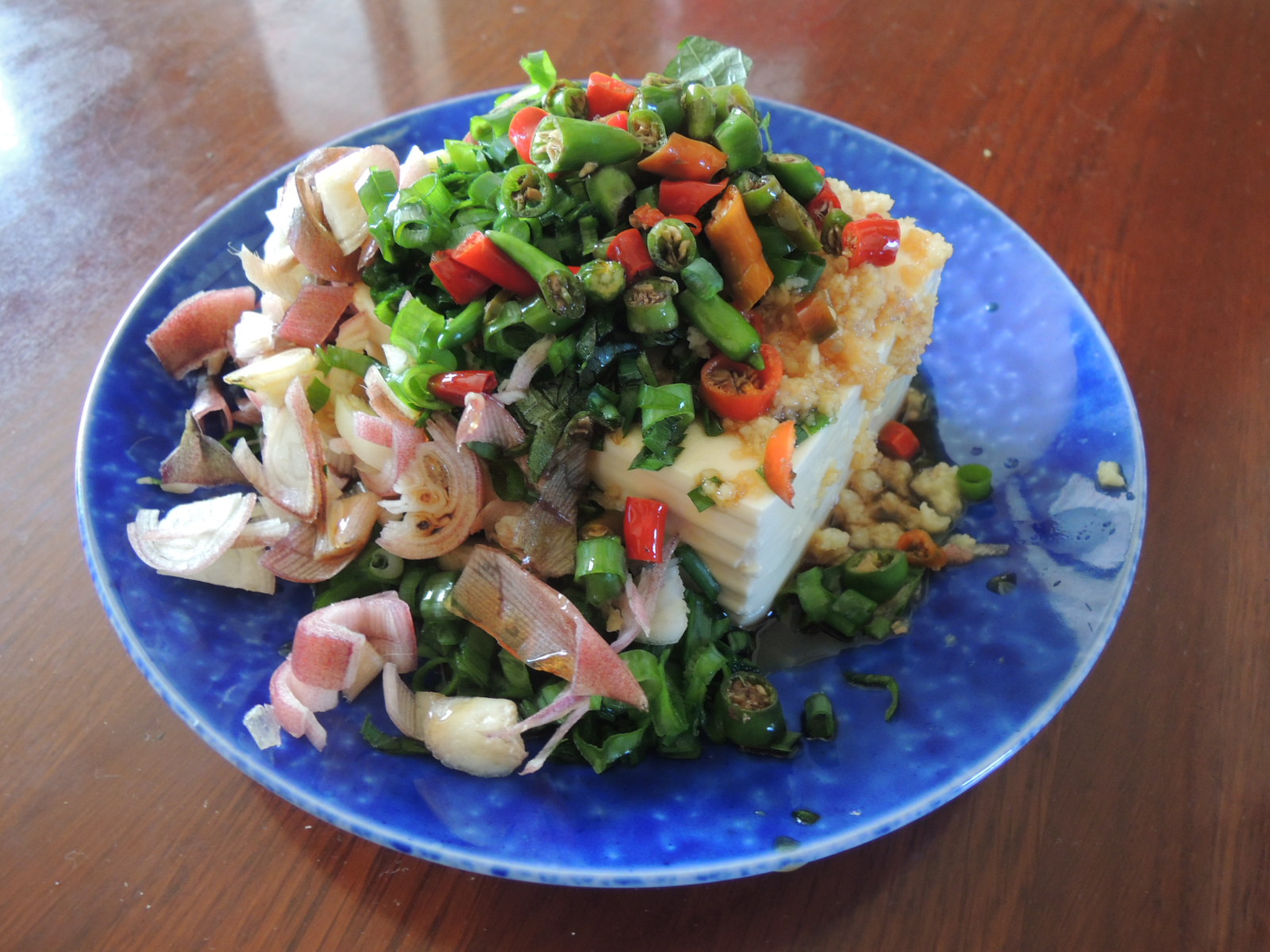 これらの薬味をザクザク刻み、半丁の豆腐にターップリかけた「健康メシ」が下の写真。