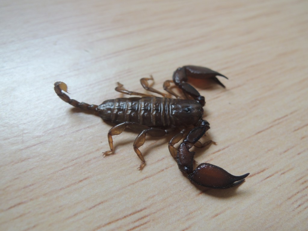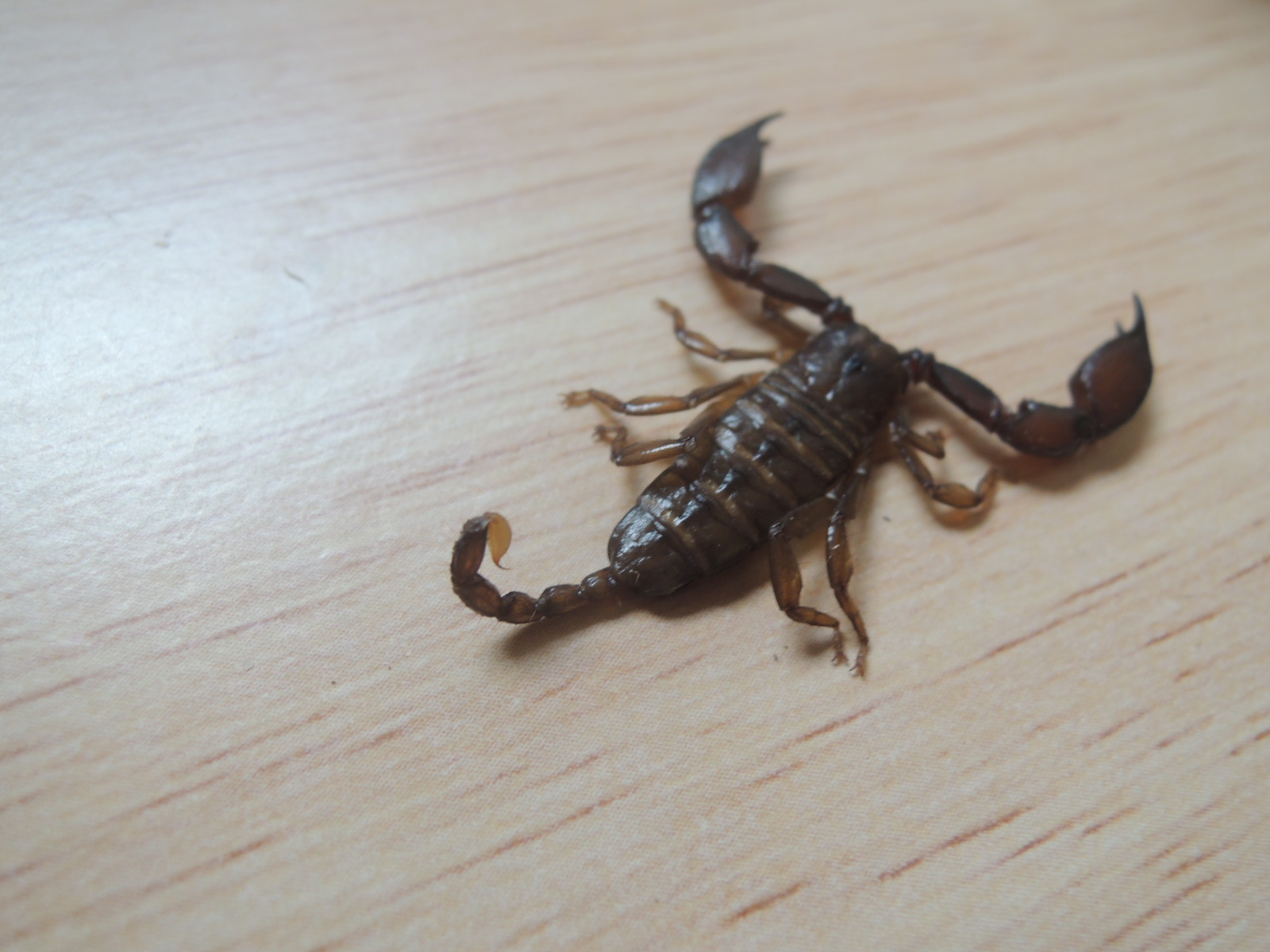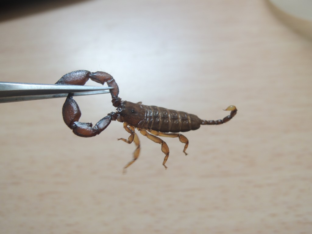 体長数センチの小型サソリなるも、尾っぽの先には特有の毒針が・・・