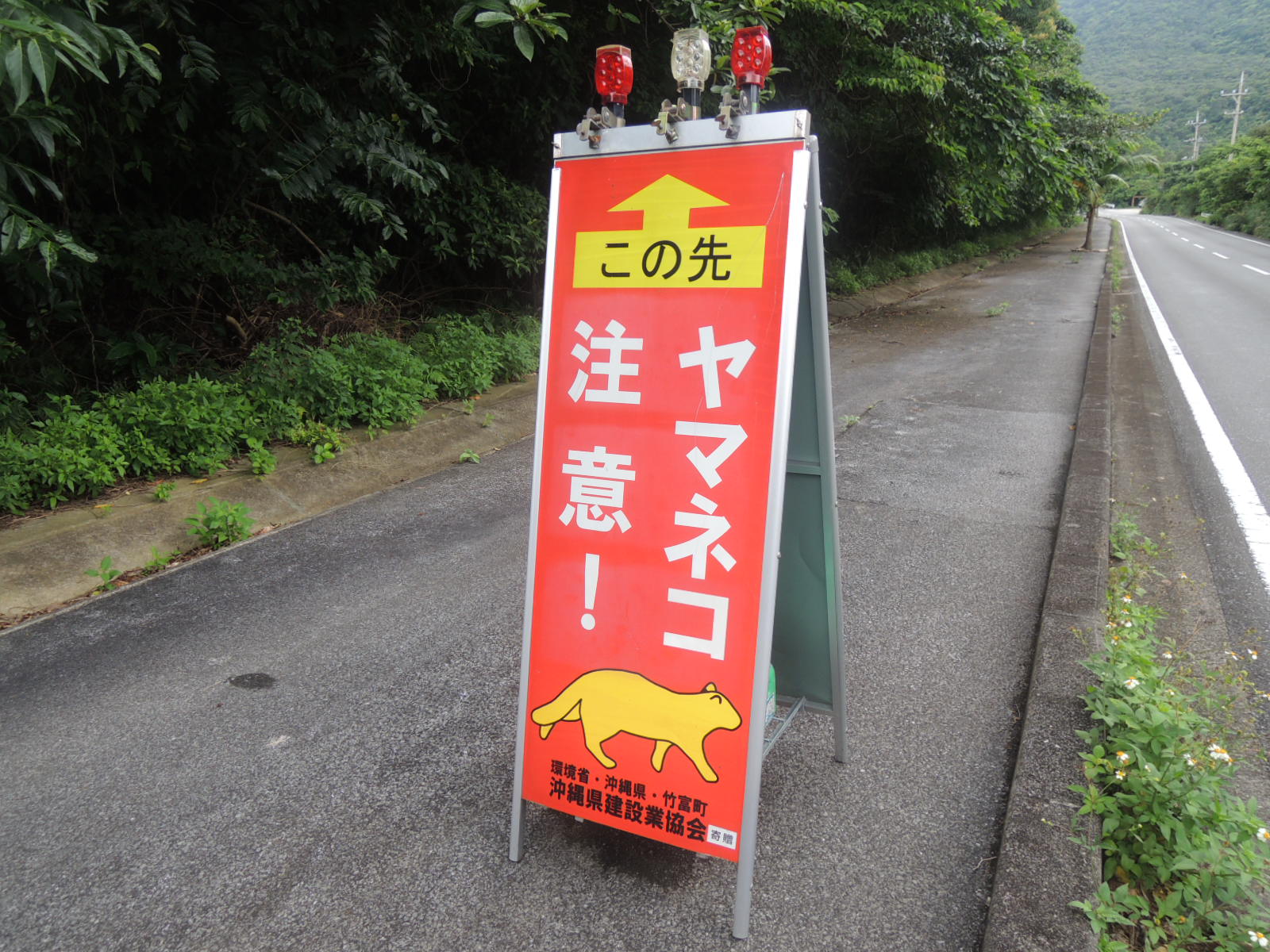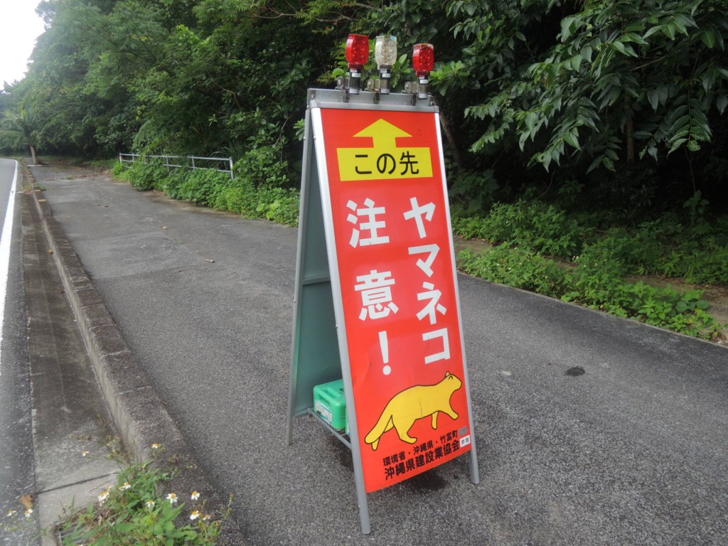 西表島の外周道路を走っていると、イリオモテヤマネコの飛び出しに注意を喚起する看板等が