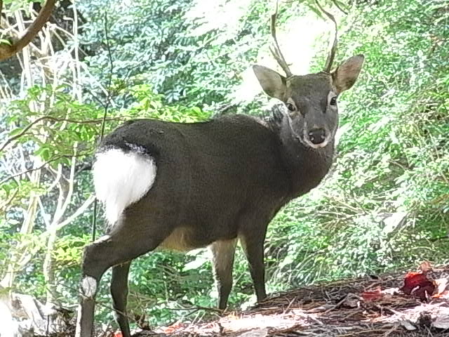 一方、ヤクジカは敏感であまり傍までは寄れないのですが、珍しく近寄っても逃げない雄ジカと