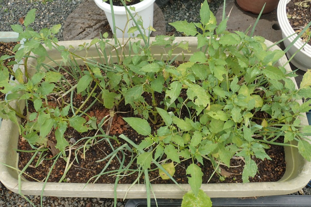 トウガラシは未だ花が付き始めたくらいで実が生るのはもう少し後、たぶん屋久島から戻る頃かな。