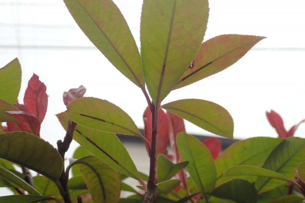 ふと垣根のレッドロビンを見ると葉裏主脈にルリカミキリの食痕が。