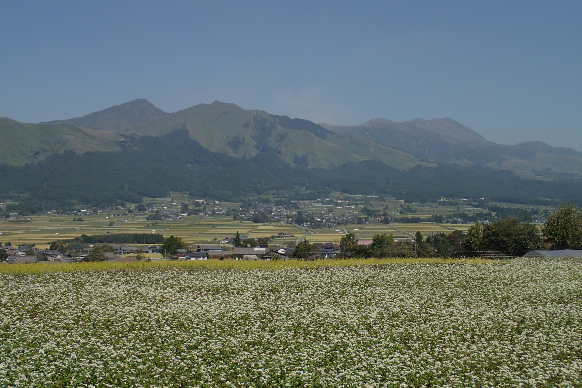 秋晴れに霞む阿蘇連山を蕎麦畑から。