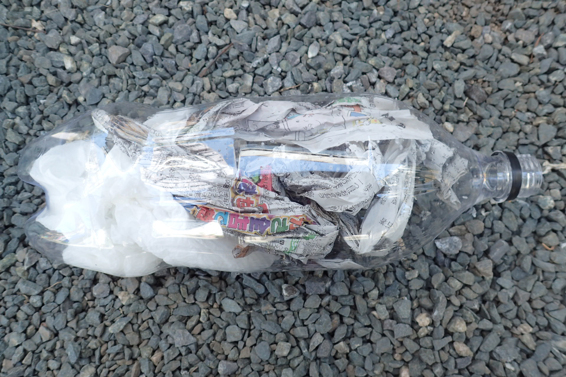 まず、空ボトルにはティッシュを数枚詰め込み、その後新聞紙を細長くねじって差し込みます。