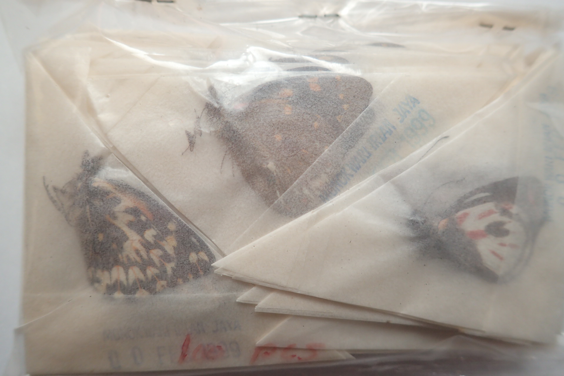 上記アカジマトラの産地に近い渓谷に倒れていたモミ大木の細枝から羽脱したもの。 野外で採ると
