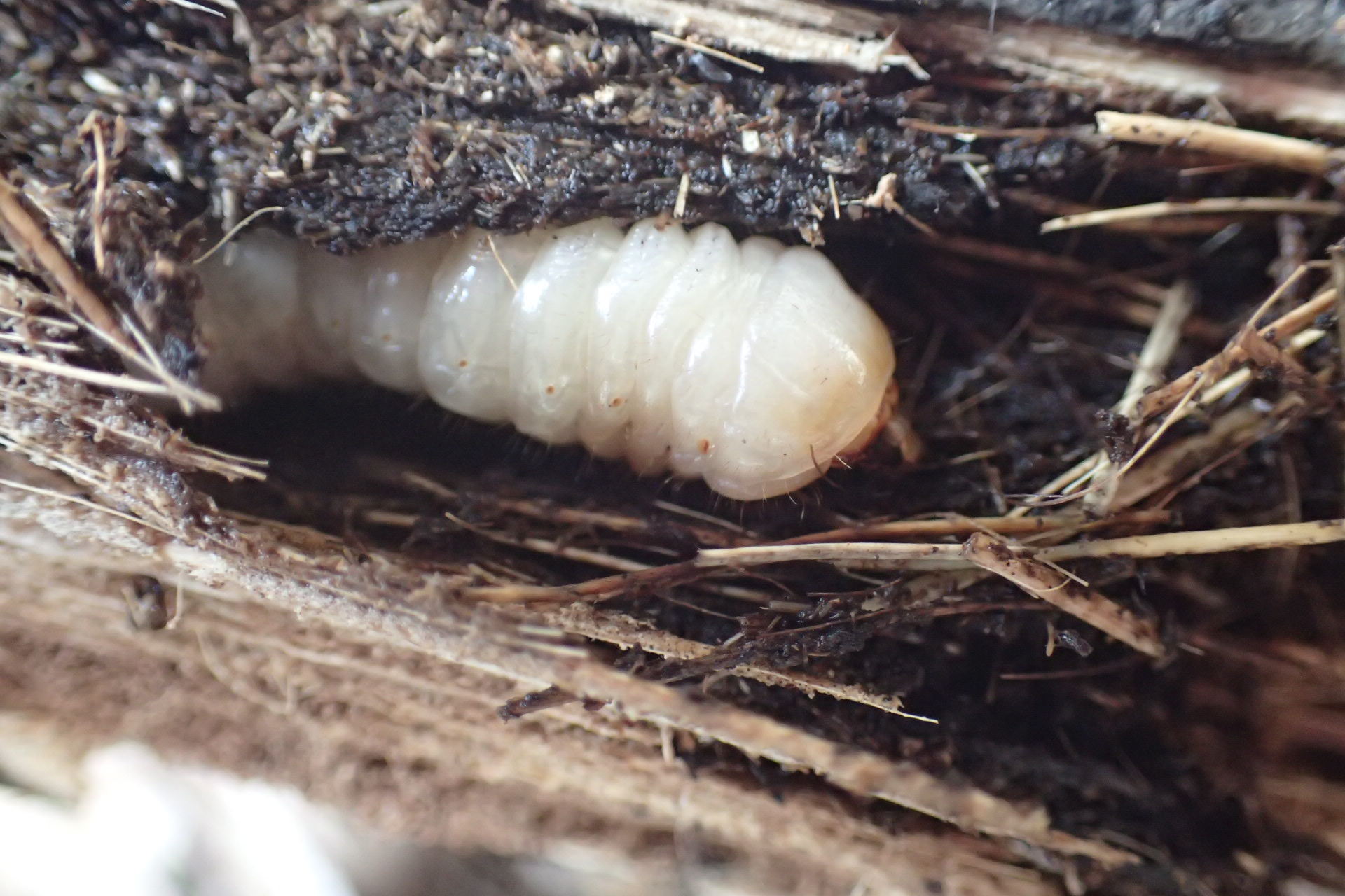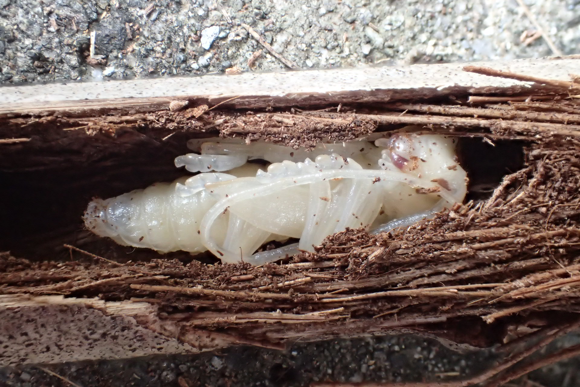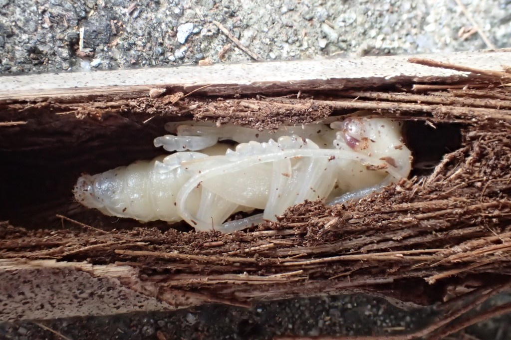 クロツグの材をほじくると、出て来たのは主題のヨツスジカミキリの幼虫。