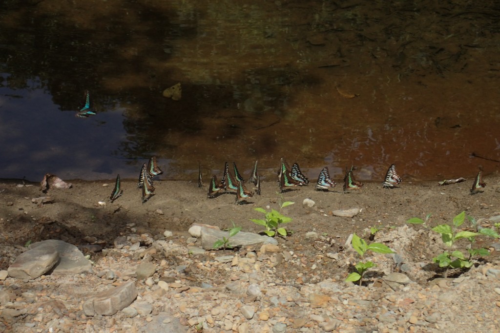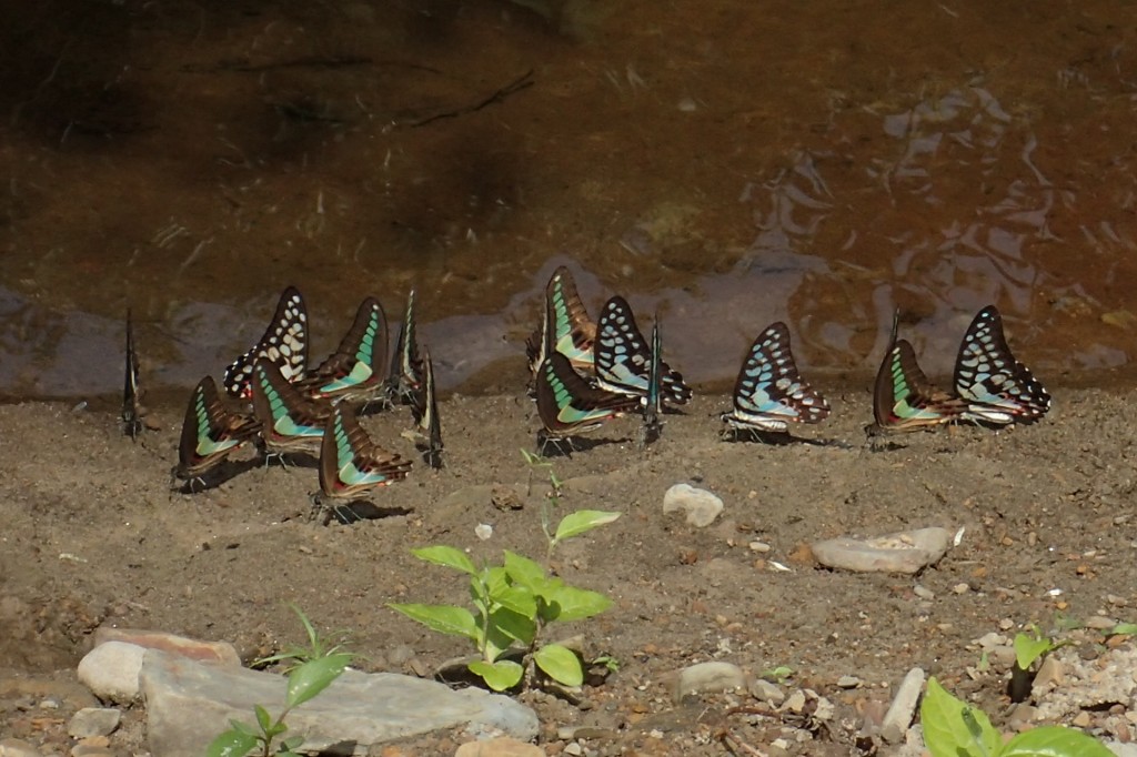 河原で給水するミカドアゲハとアオスジアゲハ。