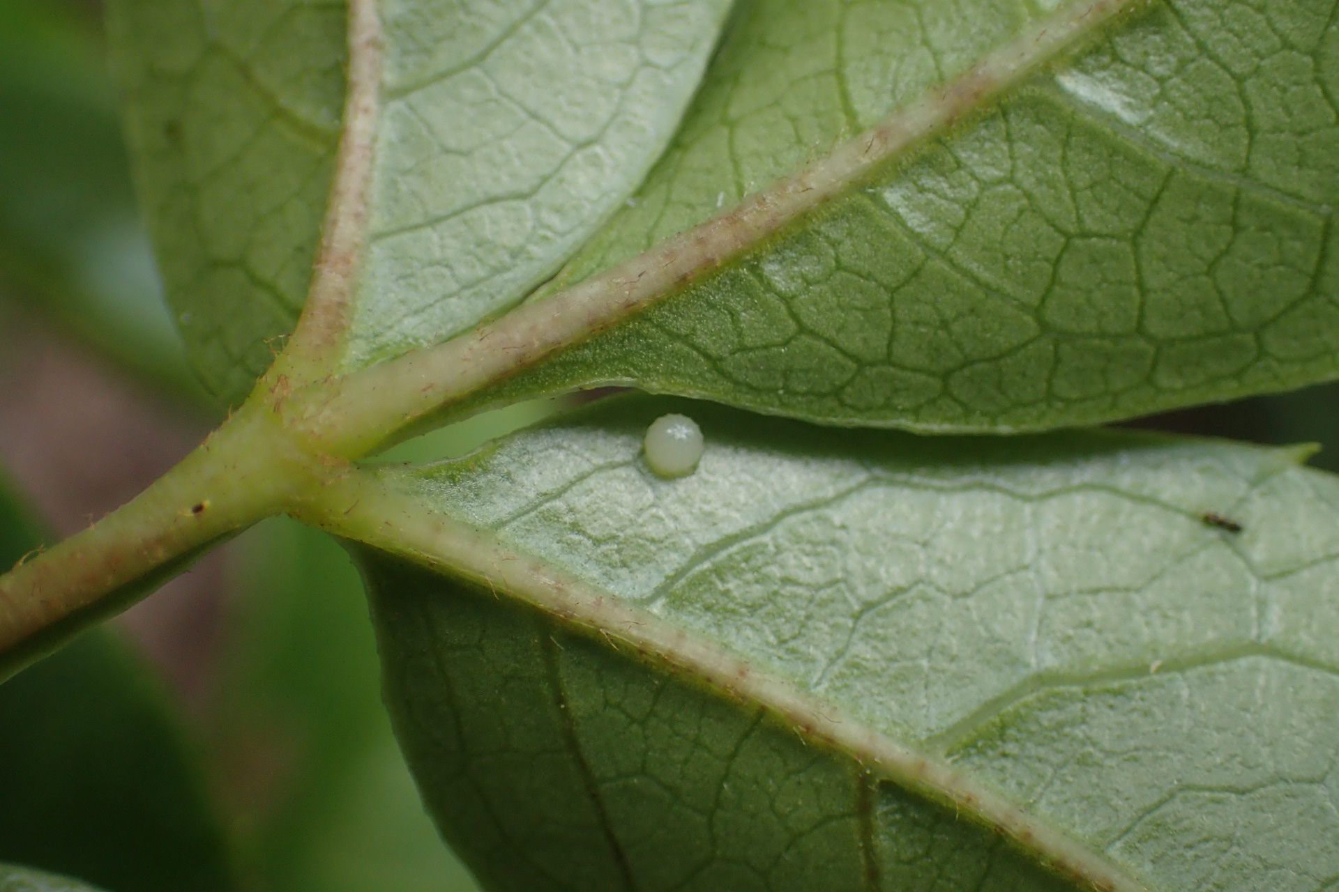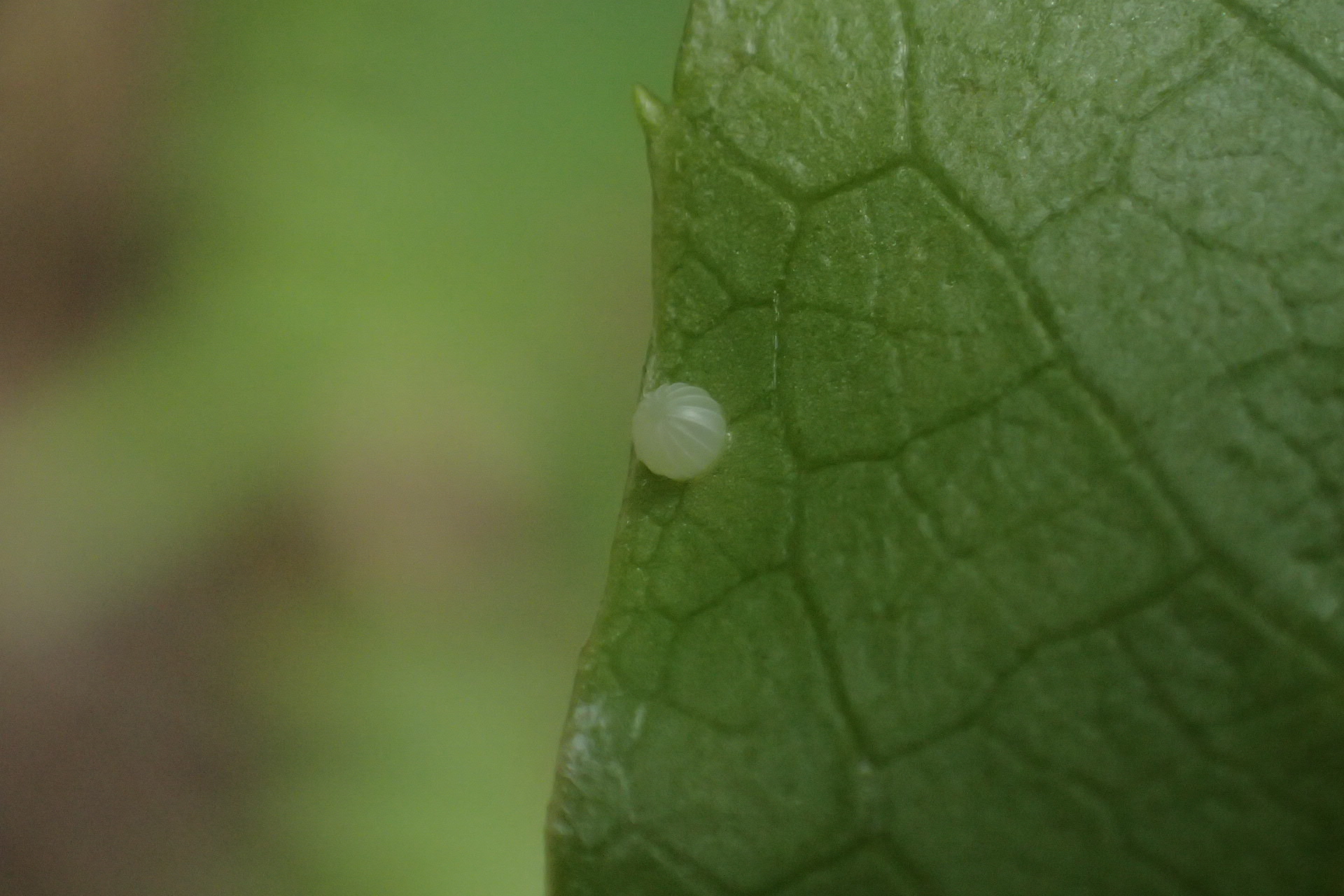 母蝶が飛び立った後で葉を裏返すとタテハ特有の形状の卵が。