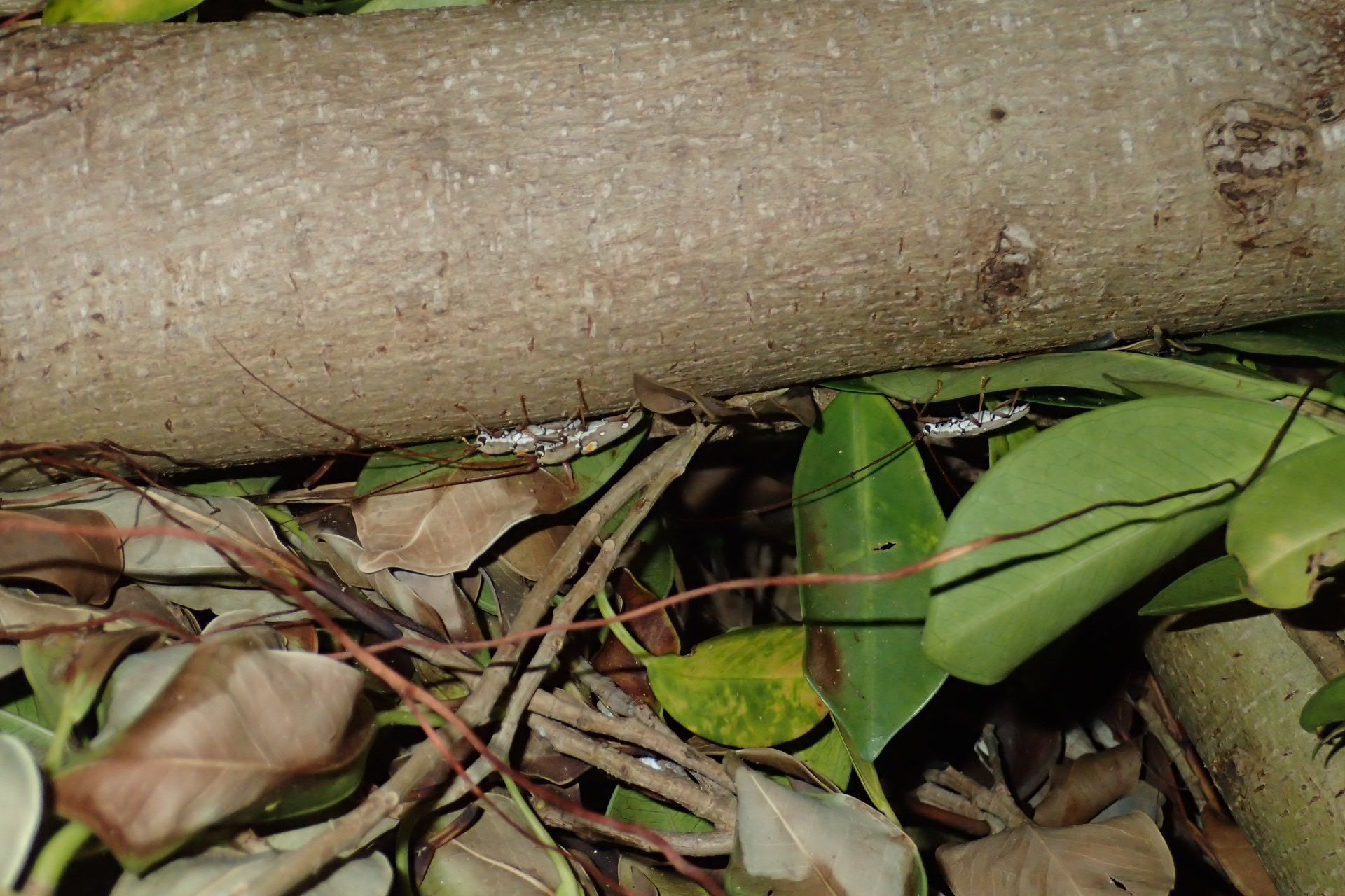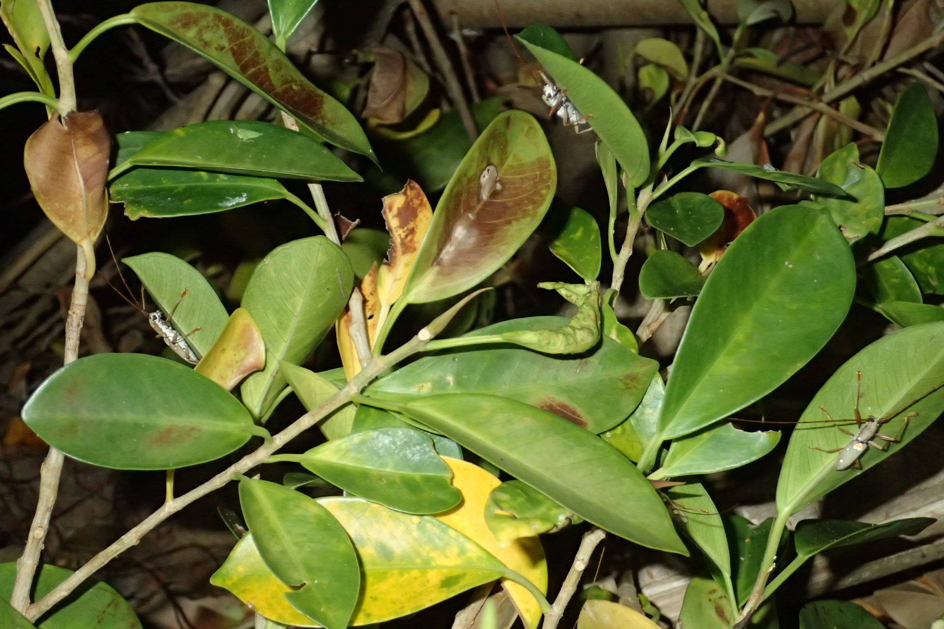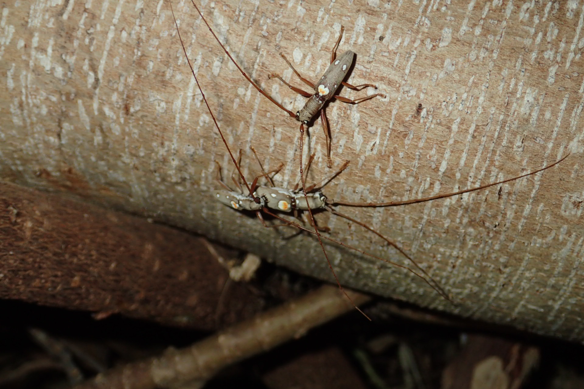 件のクワ科の木々の上では、昼とは違ってイツホシシロカミキリが沸いていました^^