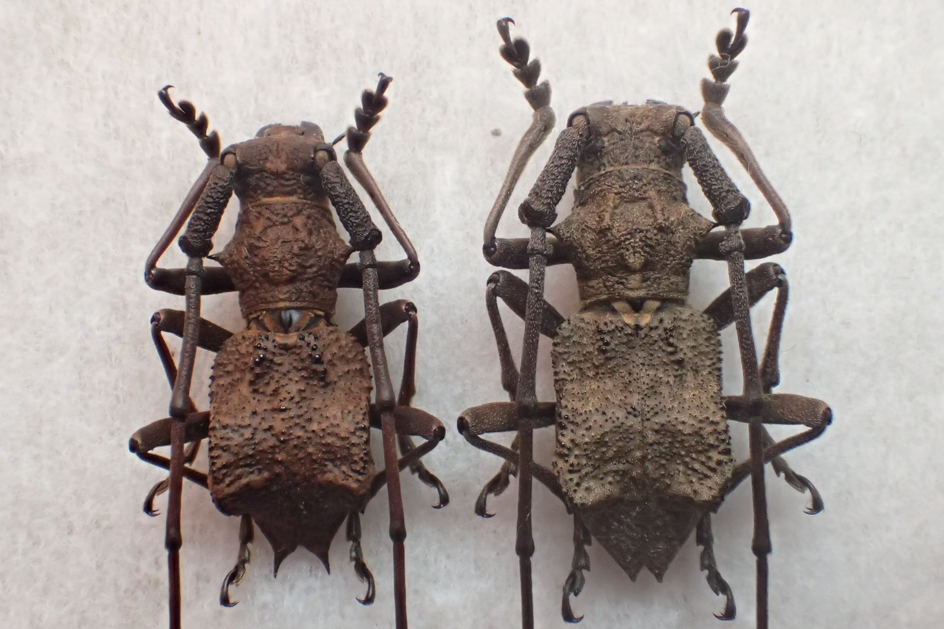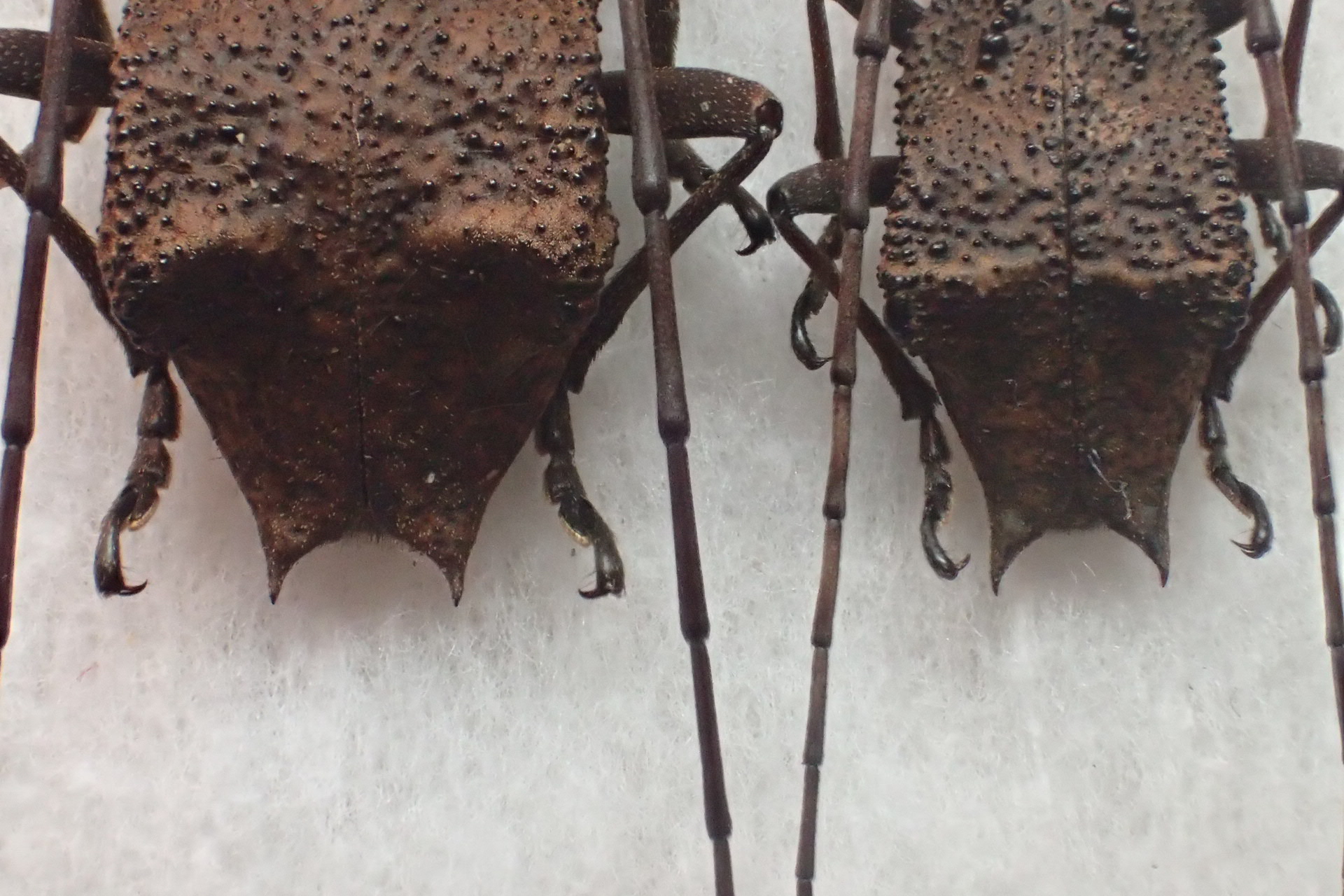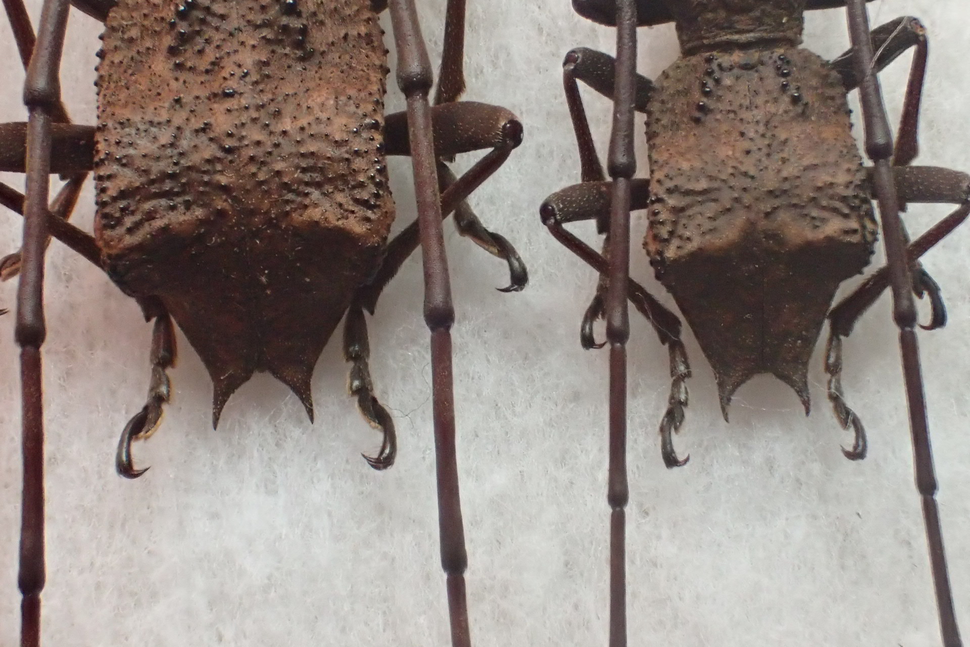 次はナンキコブの特大飼育個体。上の野外品と♂♀同士を並べてみると翅端のトゲはやや短め