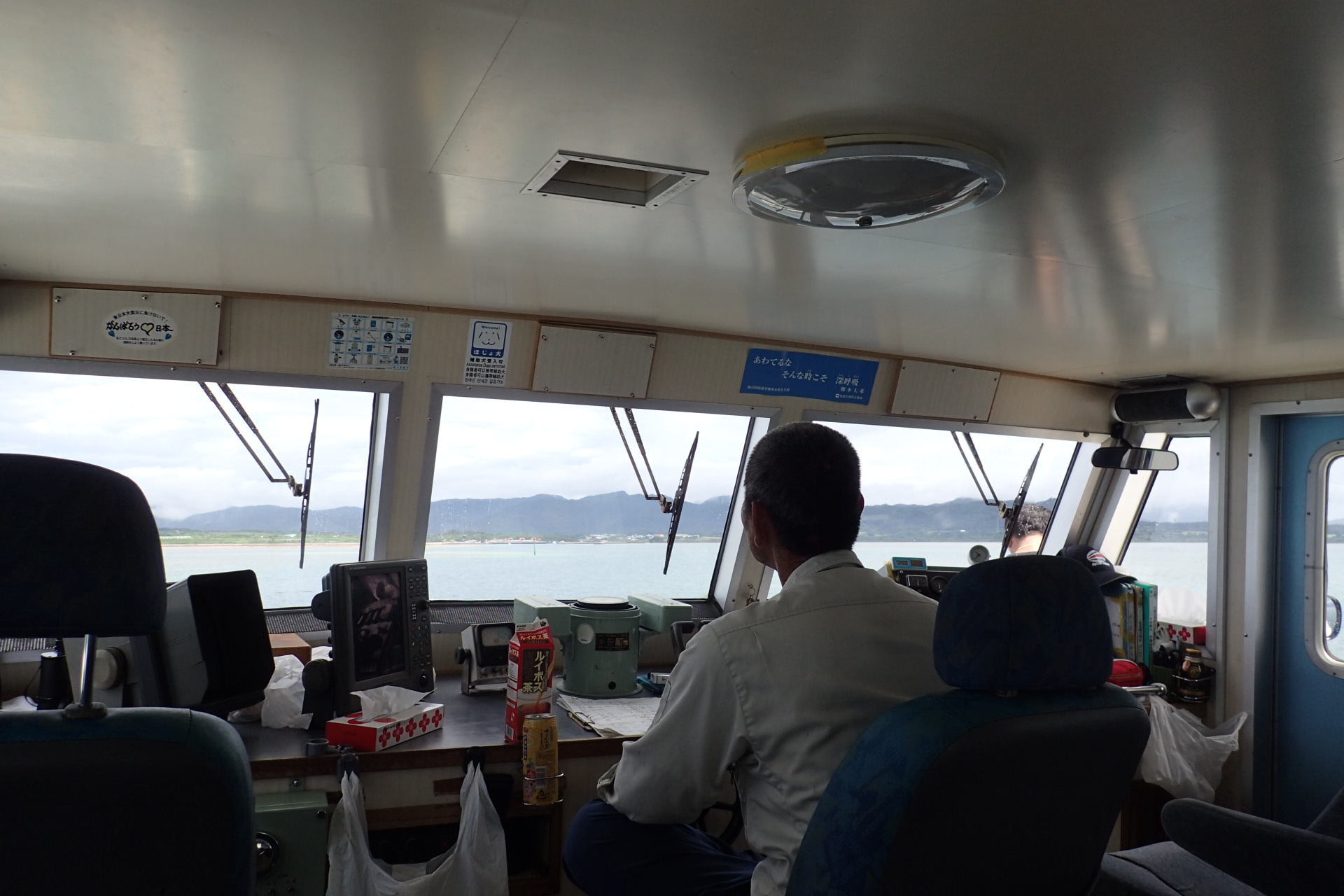 貨客船長の頭越しに見える西表島。