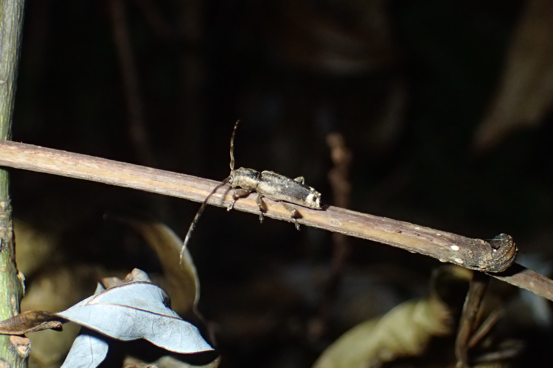 細枝を齧るハスオビヒゲナガカミキリ。