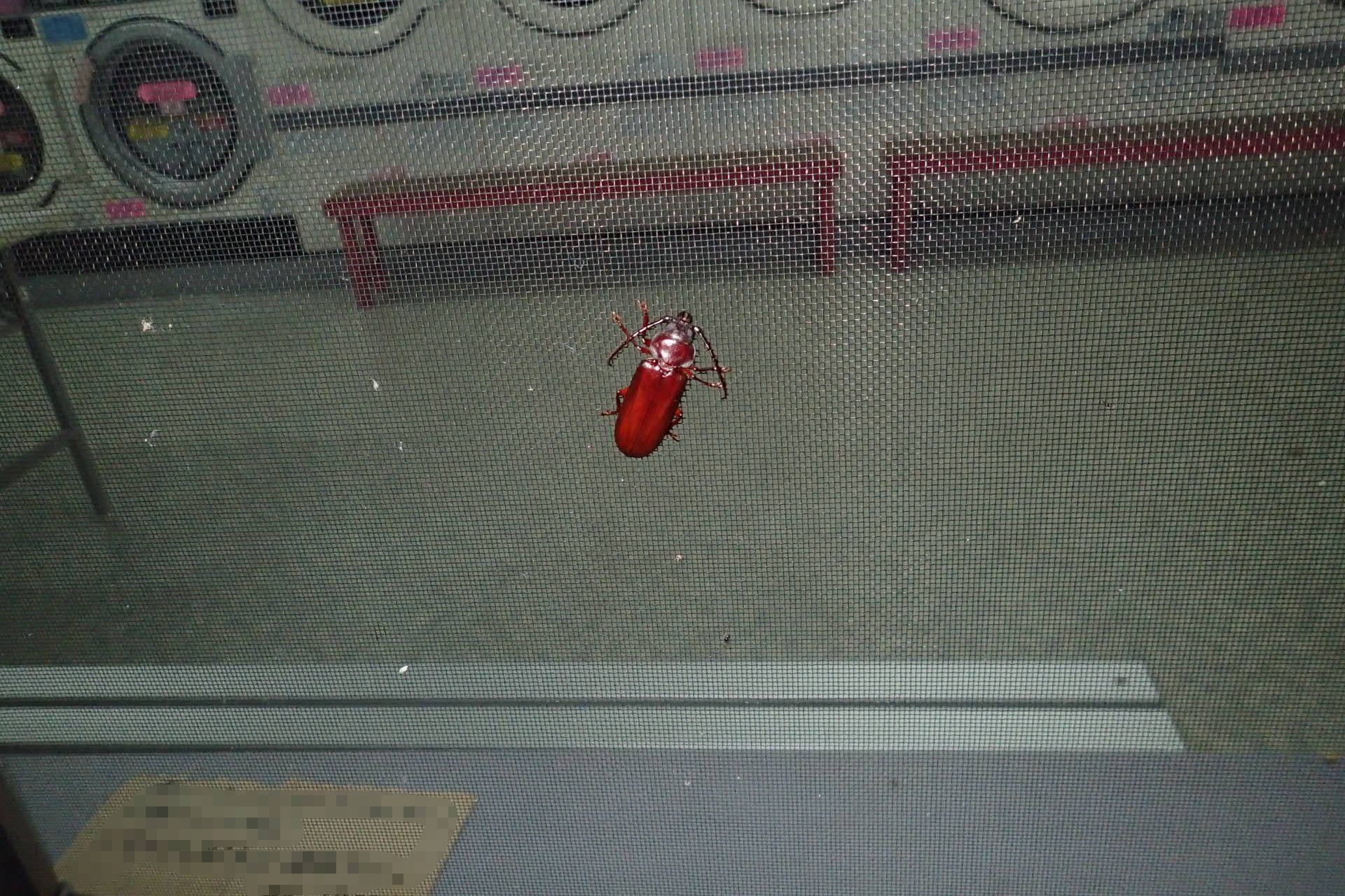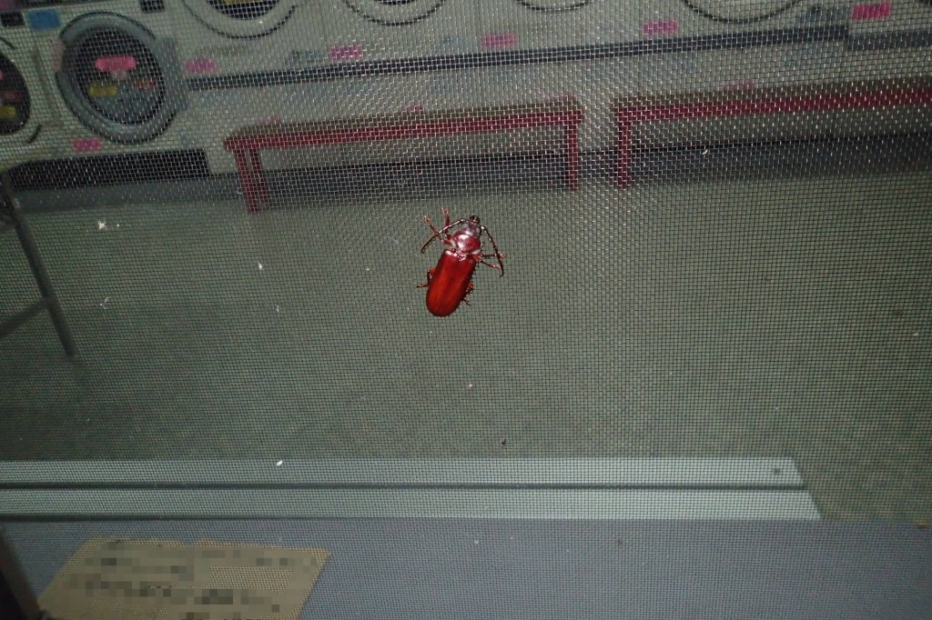さて洗濯を、と夜間コインランドリーを訪れた際に窓のサッシに留まっていたベーツヒラタカミキリ。