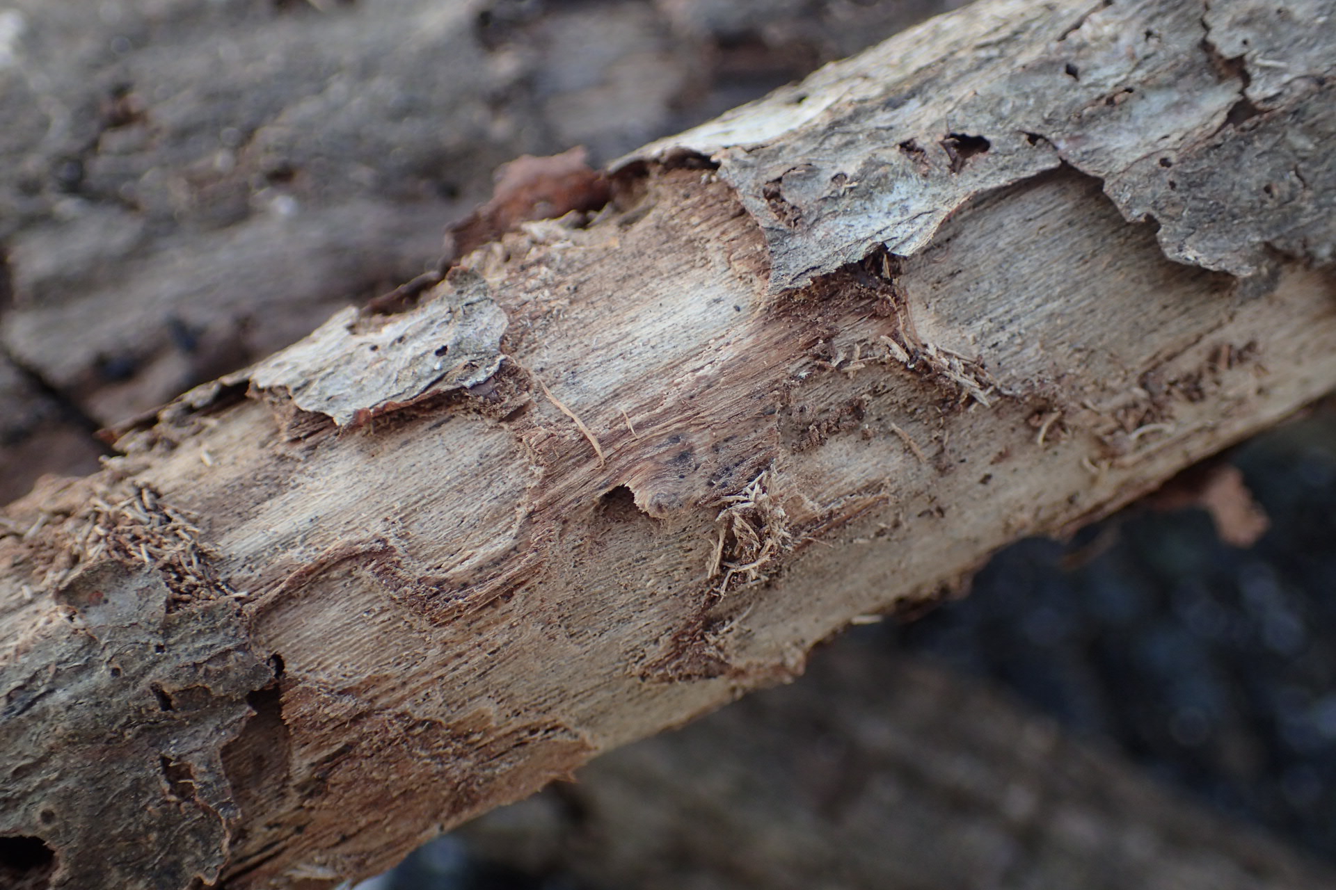 樹皮下をウネウネと食われ樹皮が剥がれた状態。食入口も分かりますね。