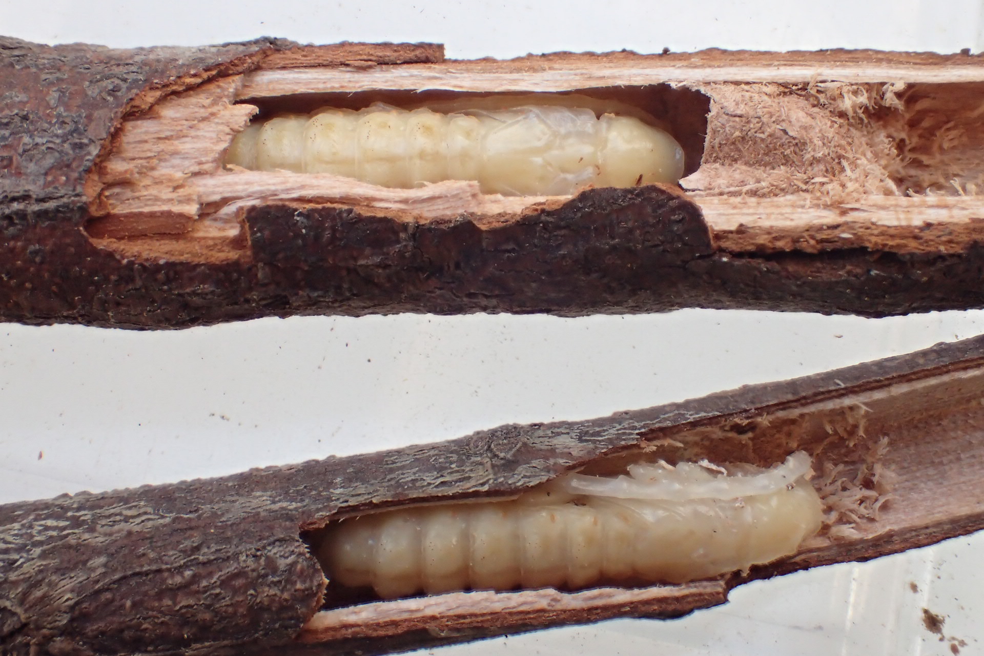 採ったアマミクスベニカミキリの幼虫が材中で蛹化していました。
