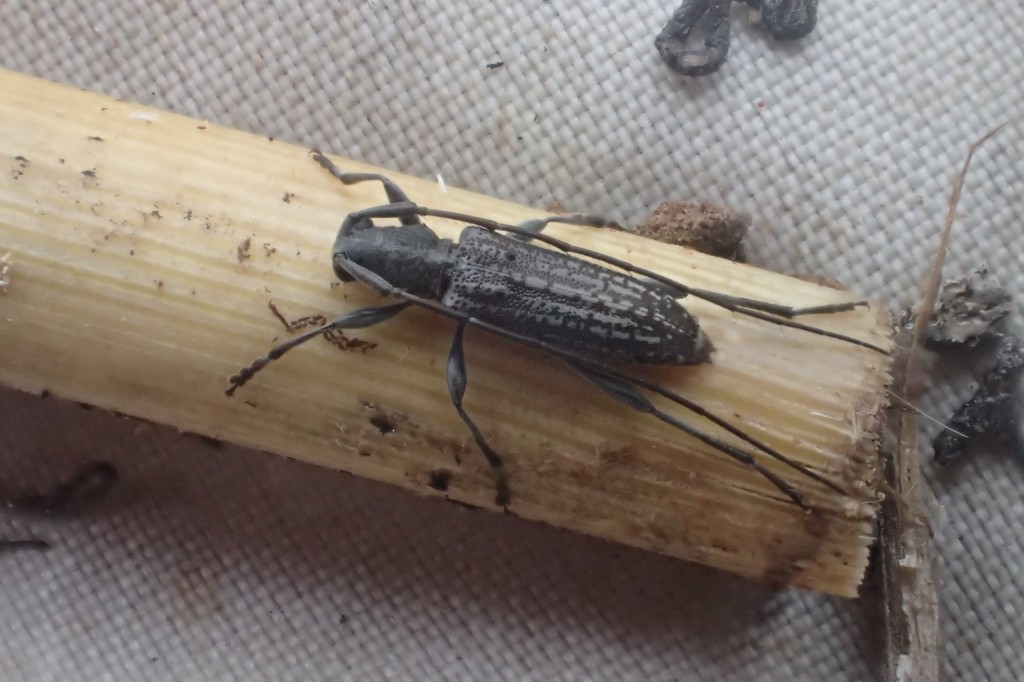 徳之島某所の焼けススキを叩いたところ、抜け落ちた茎に偶然留まったシロスジトゲバカミキリ♂。