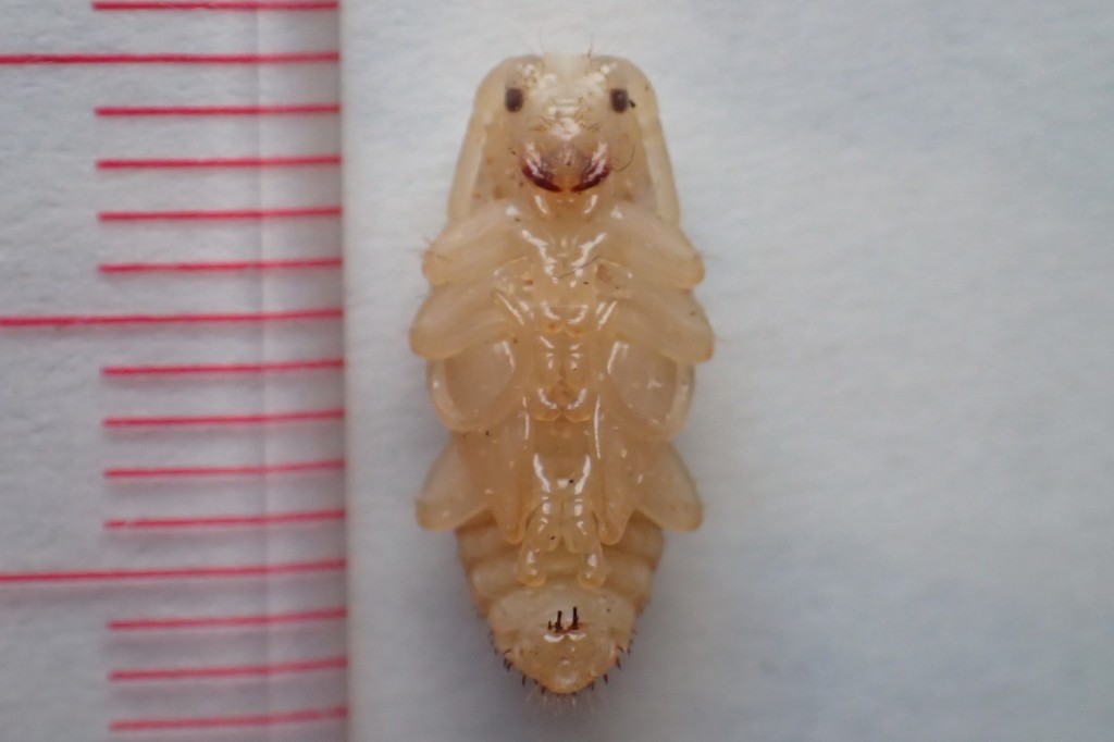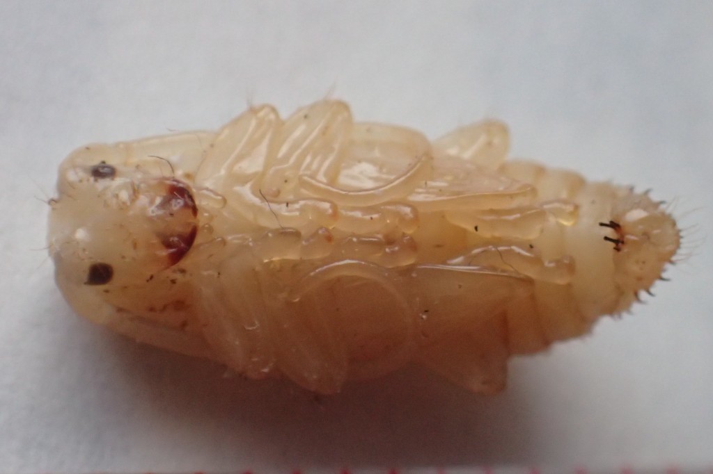 採集後5日程度の蛹。既に複眼およびマンディブルが色付き始めました。結構大型の♀のようです。