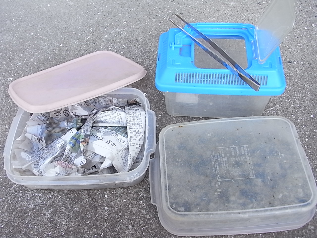 まず左が濡らしたティッシュと古新聞(いわゆるオムツ)を詰め込んだタッパー、右上が一旦センチ達を