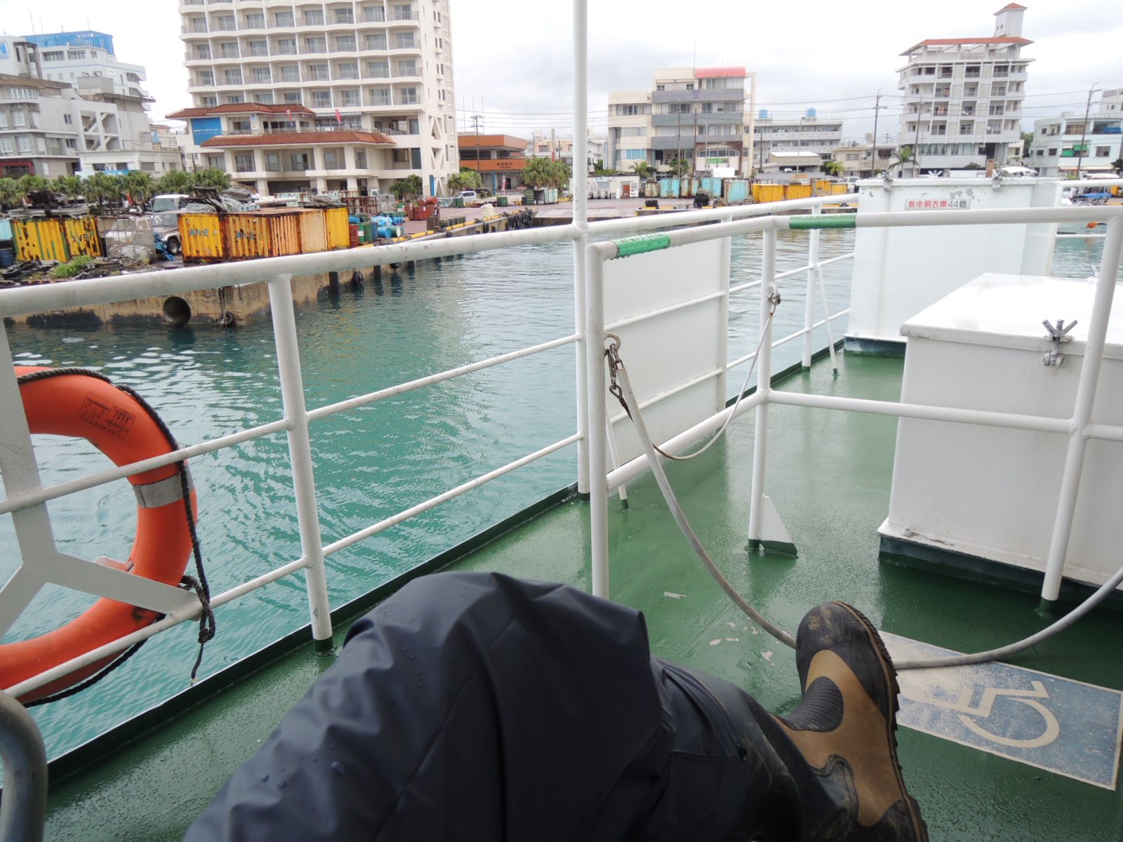 雨の中をバイクで港まで来たのでカッパと長靴のいでたちです^^