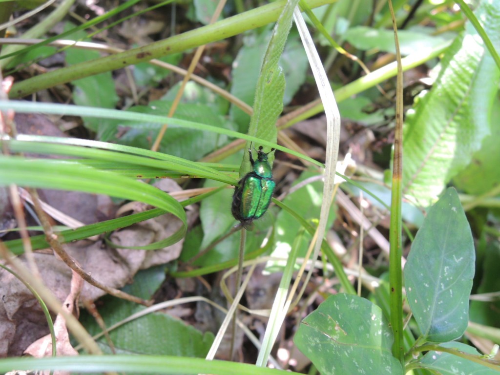 慌てて音のする地表付近に目を凝らすと、緑に輝くオオヒゲブトの♀が雑草の葉っぱの下で必死に
