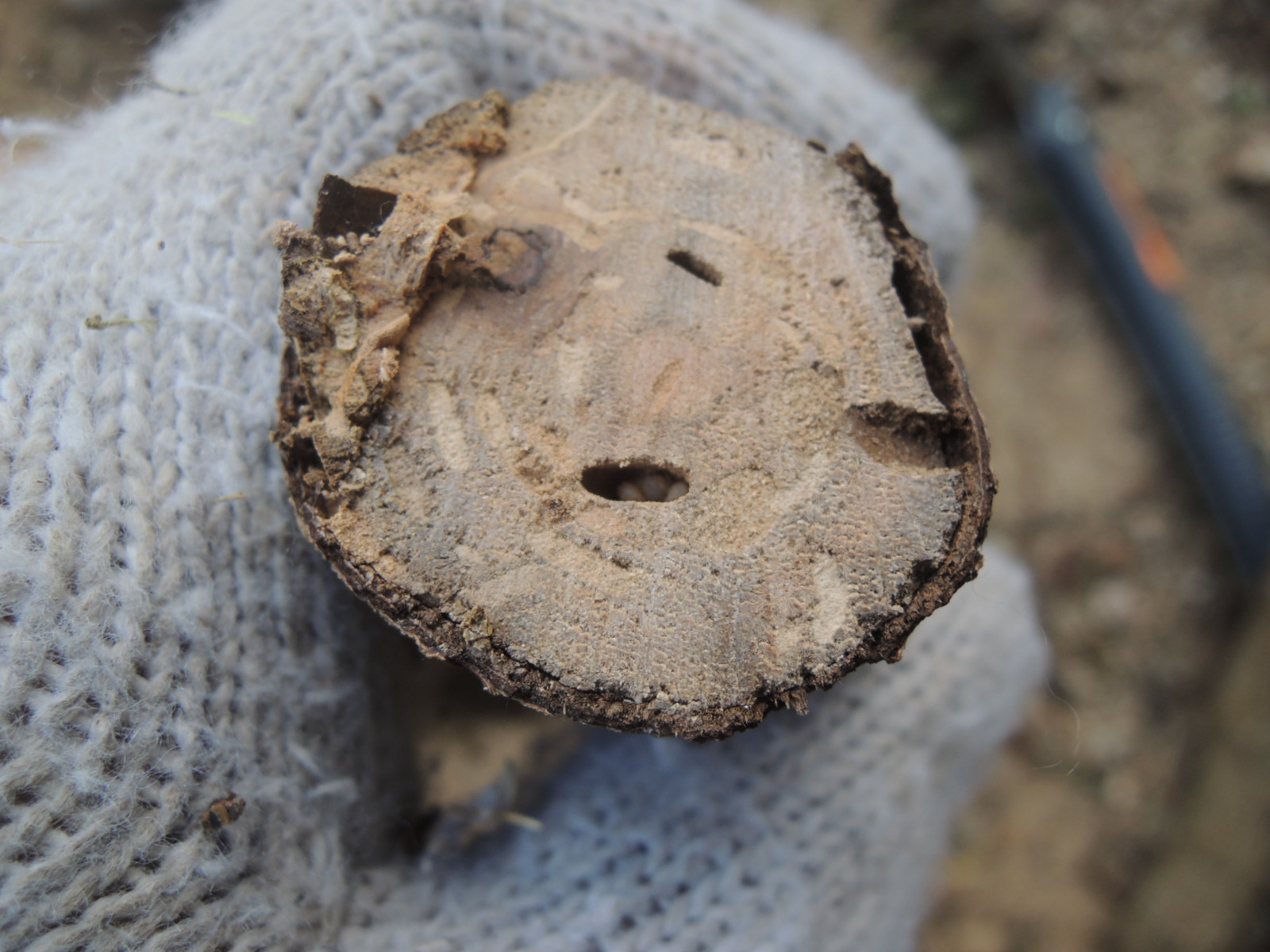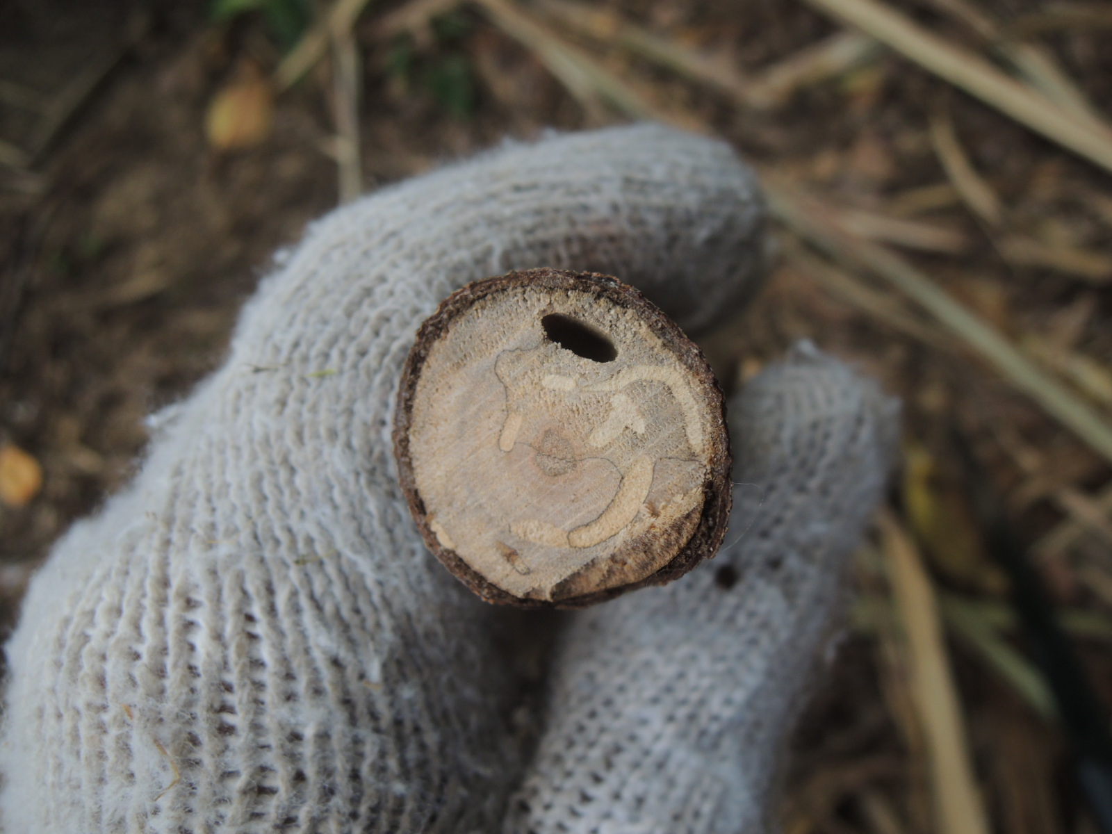 これは切断面に現れた蛹室を覗いところ。他種の蛹とは異なり、目立つ太い腿節が本種であることを