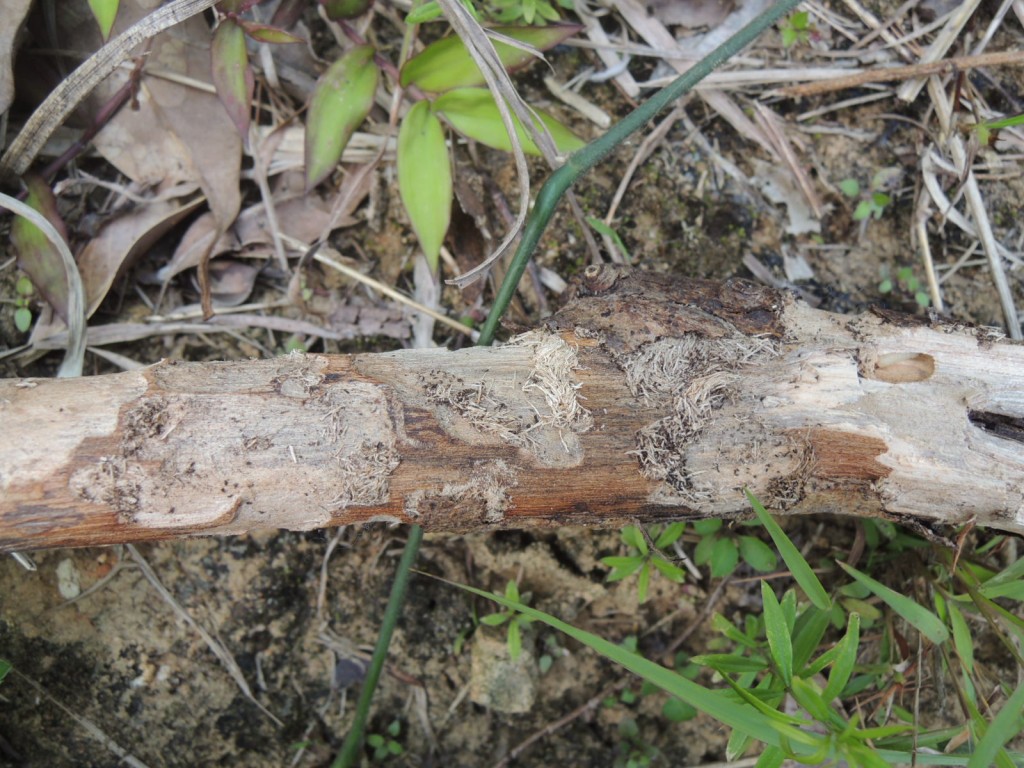 樹種はほぼ問わず、乾燥気味に枯れた樹皮下を食い、このように細かい繊維くずが目立ちます。