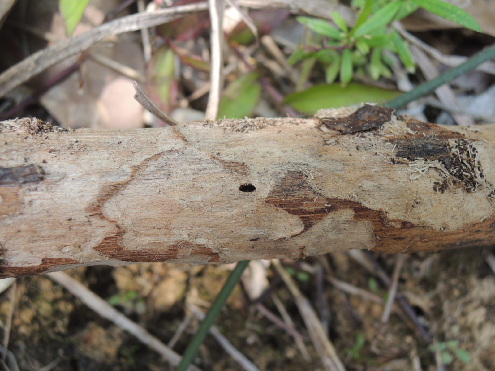 今日はチョー普通種たるシモフリナガヒゲカミキリの食痕のお勉強です。
