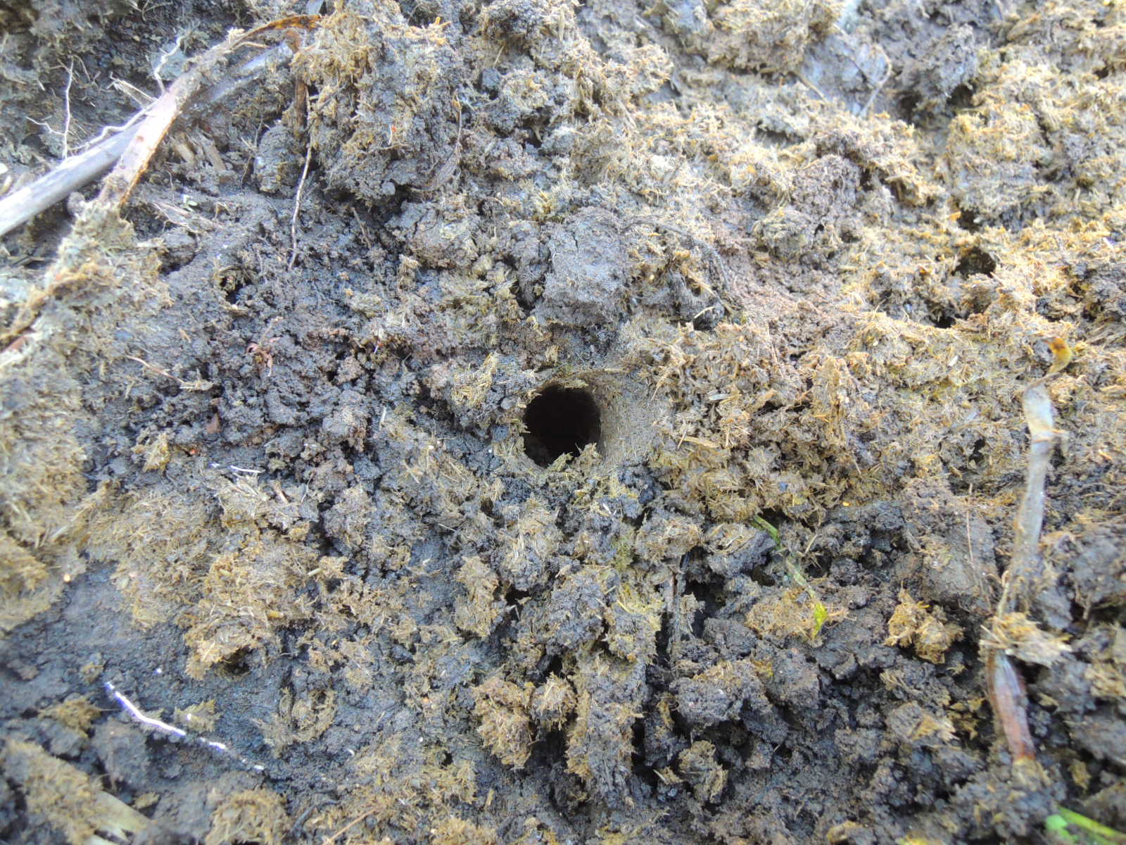 糞をよけると既に地中深く潜った跡が。