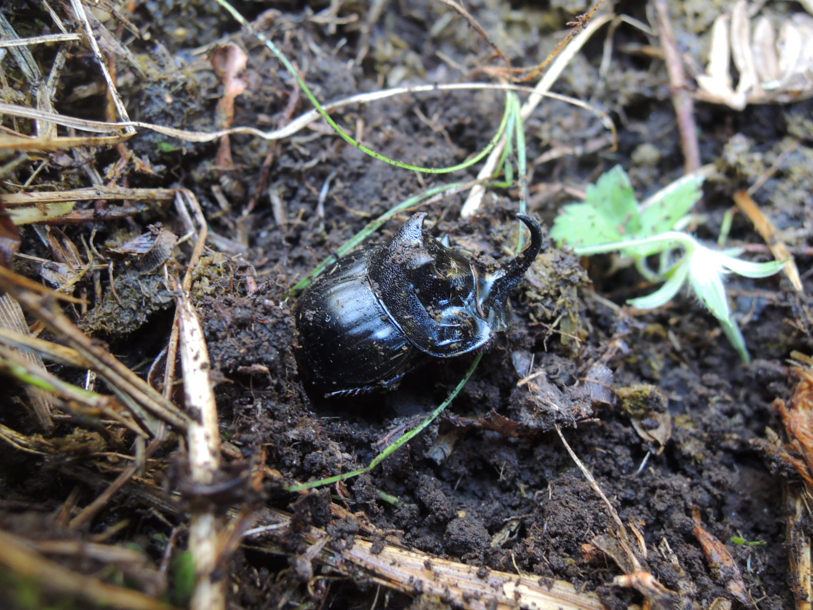 慌てて音のする地表付近に目を凝らすと、緑に輝くオオヒゲブトの♀が雑草の葉っぱの下で必死に