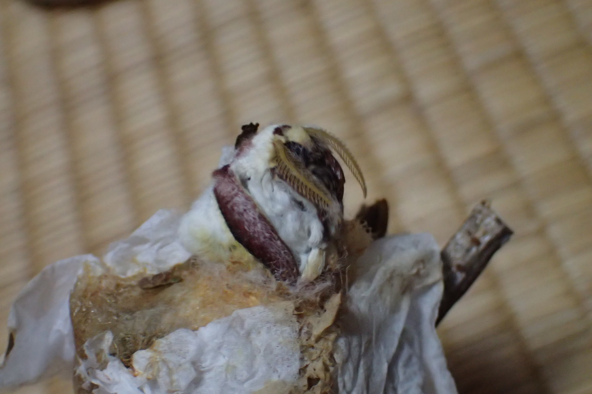 回収中に繭を壊さざるを得ないものが幾つかありました。動かなくなった前蛹をティッシュの上に