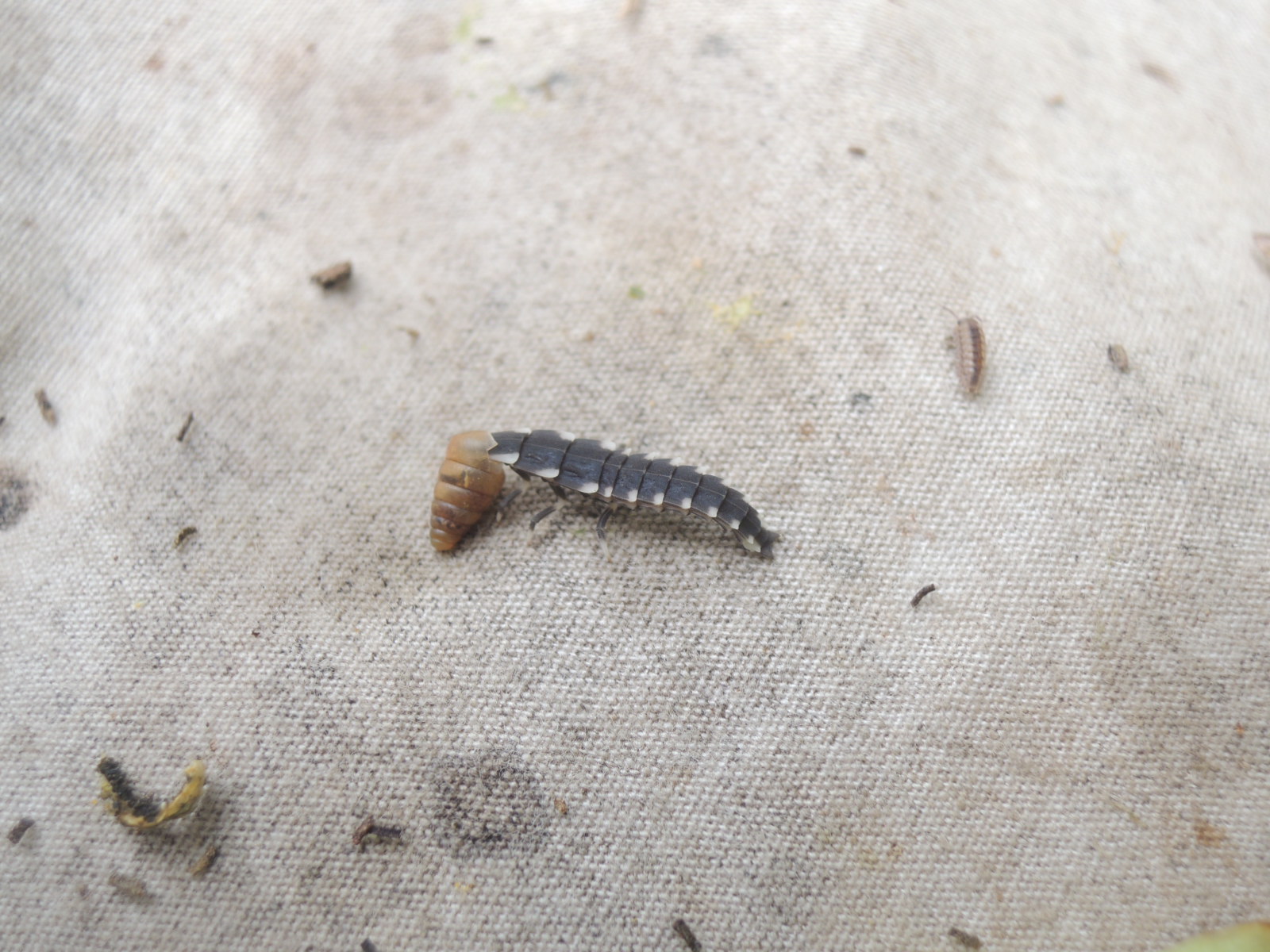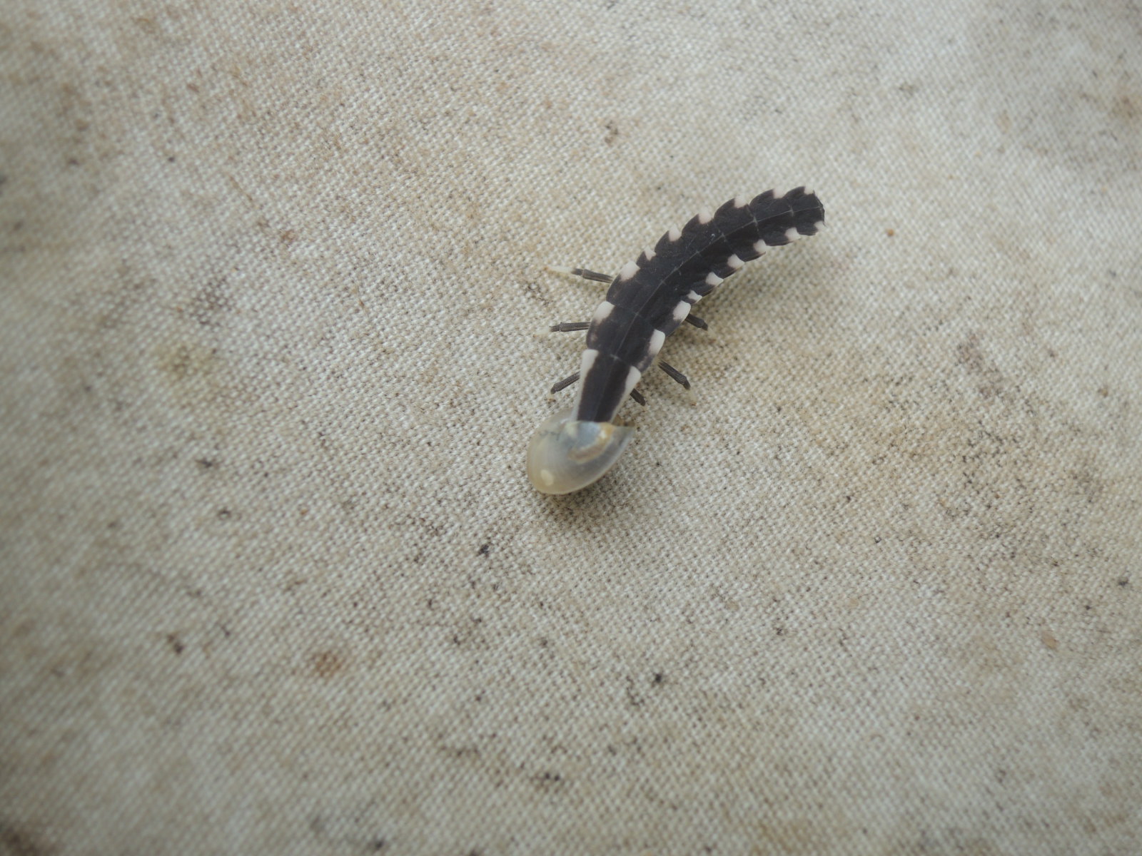林縁をビーティングしていたら、ウスカワマイマイに頭を突っ込んだまま落ちてきた幼虫。