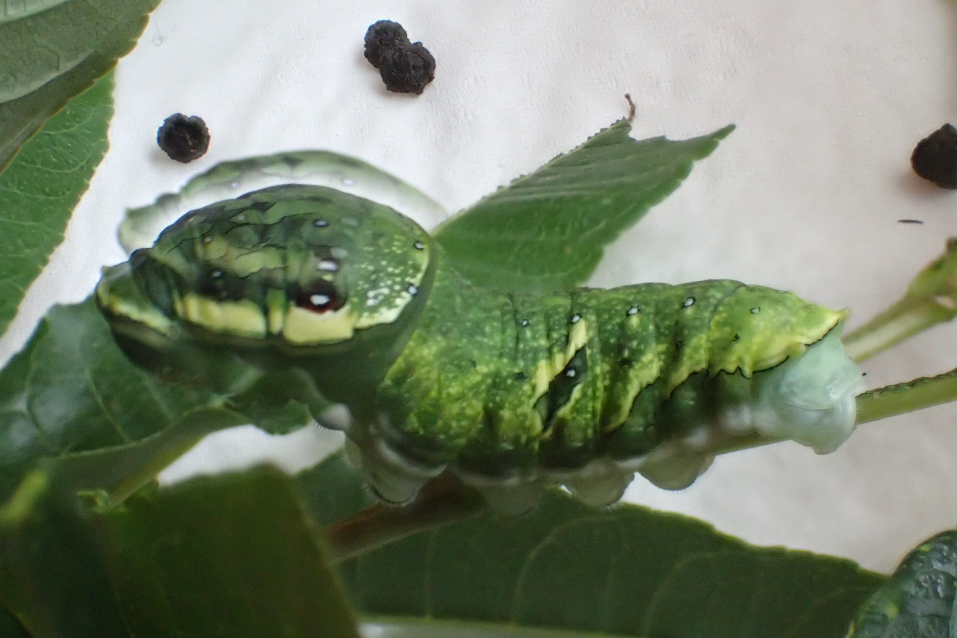 ミヤマカラスの幼虫はカマ首をもたげて上半身をユラユラさせるので、深度合成写真を撮るとこんな