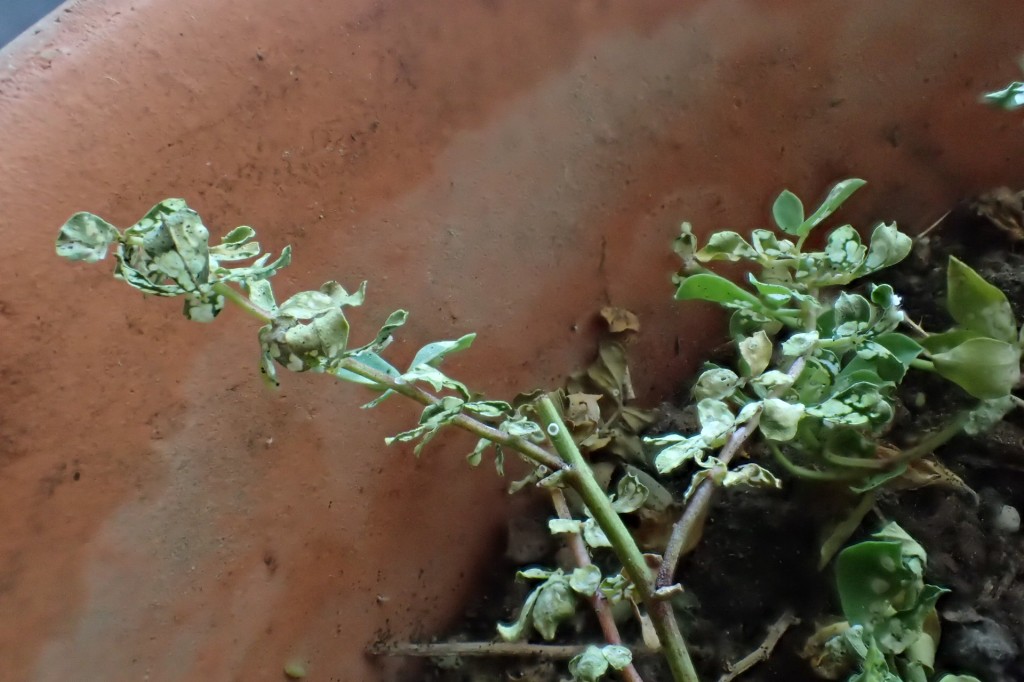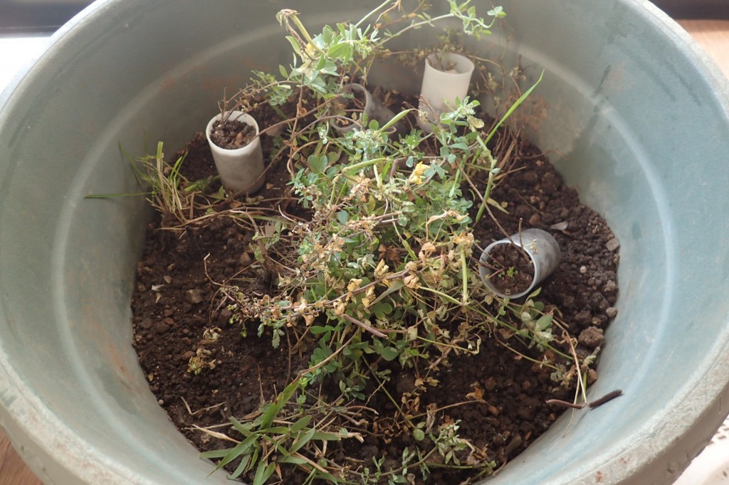 予備のミヤコグサが一株しかなかったので、近くの河原からマメ科のシロツメクサを採って来て一緒に