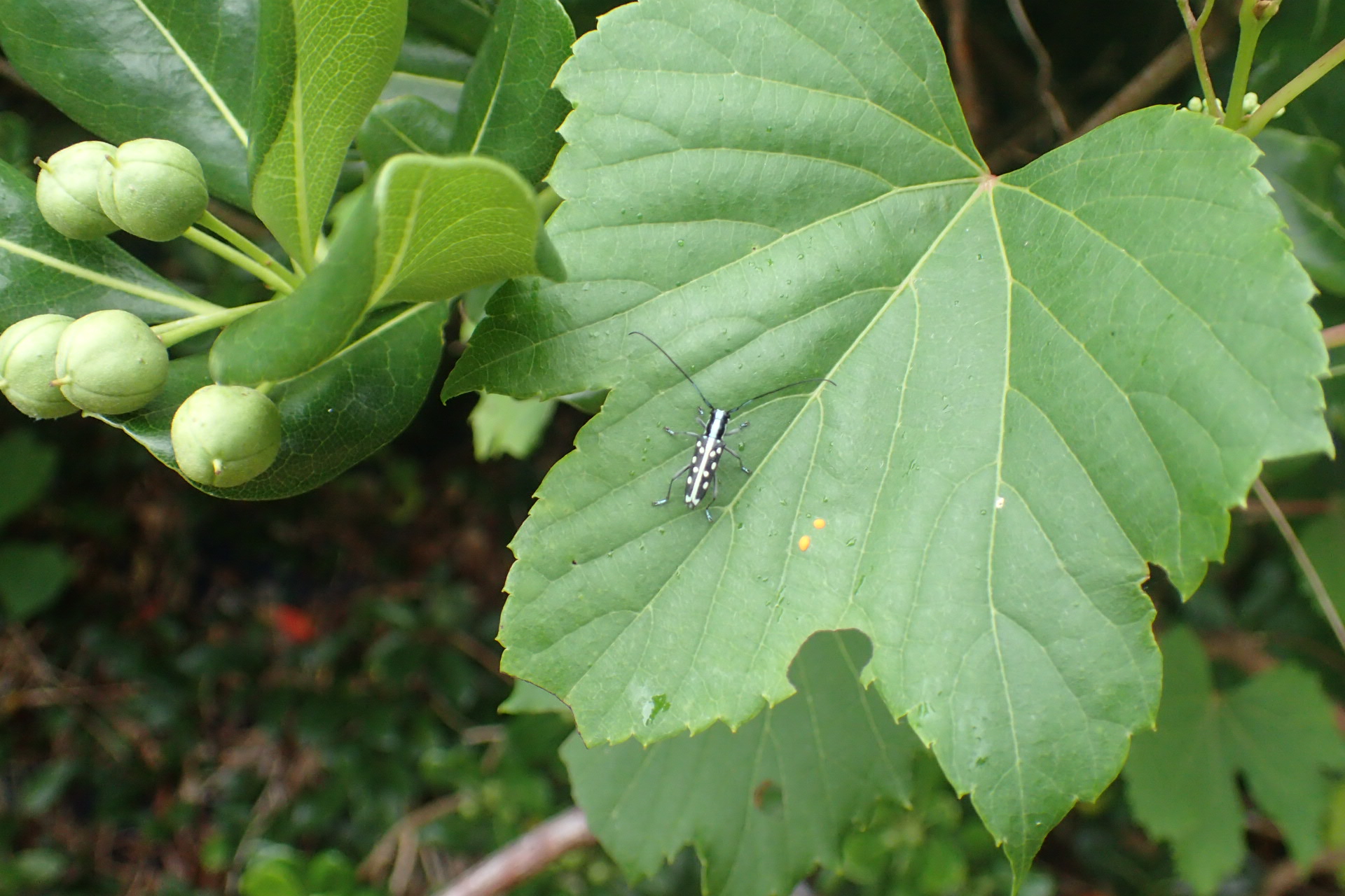 雨で濡れた食痕のある葉に留まるオキノエラブリンゴカミキリ。