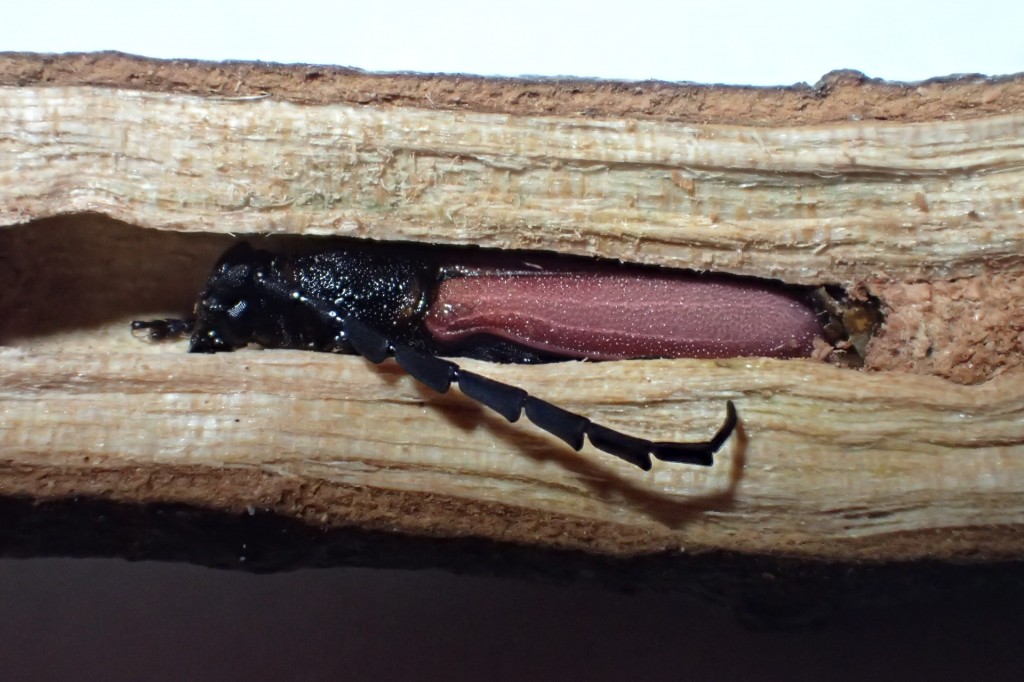 少し真面目な話をすると、クスベニカミキリ類の材は採り易いのですが実は成虫を羽脱させるのは