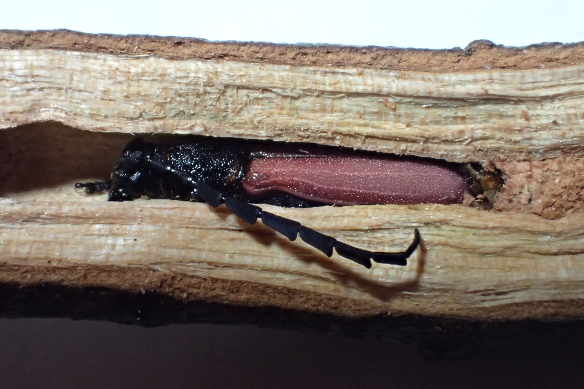 おお、蛹室の中で羽化した新成虫(♂)が現れました。未だちょっと色付き具合が淡いですね。