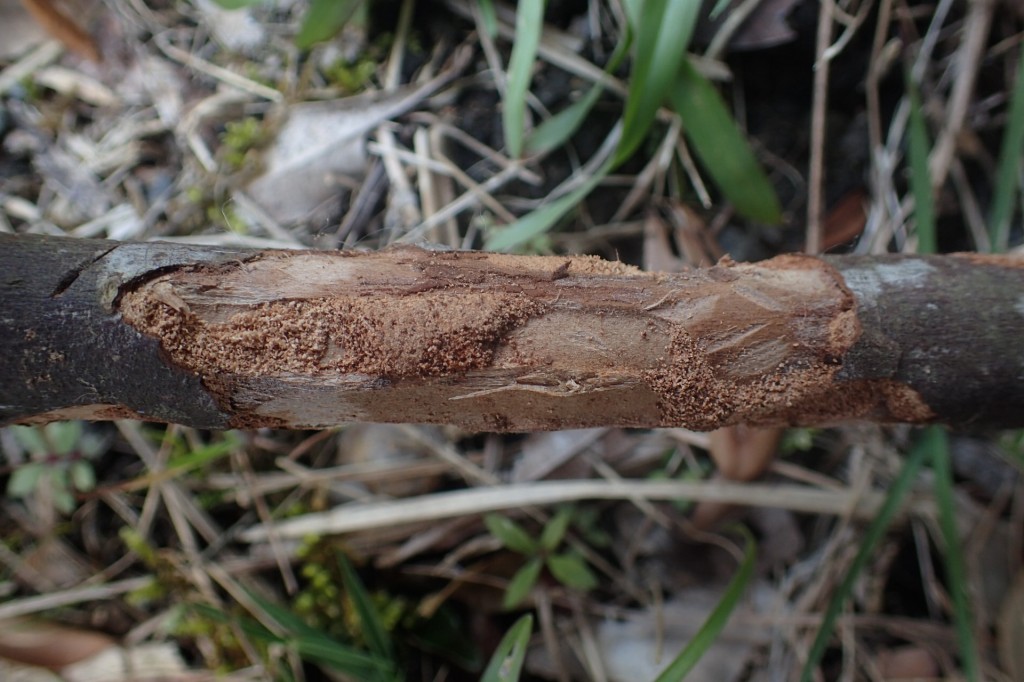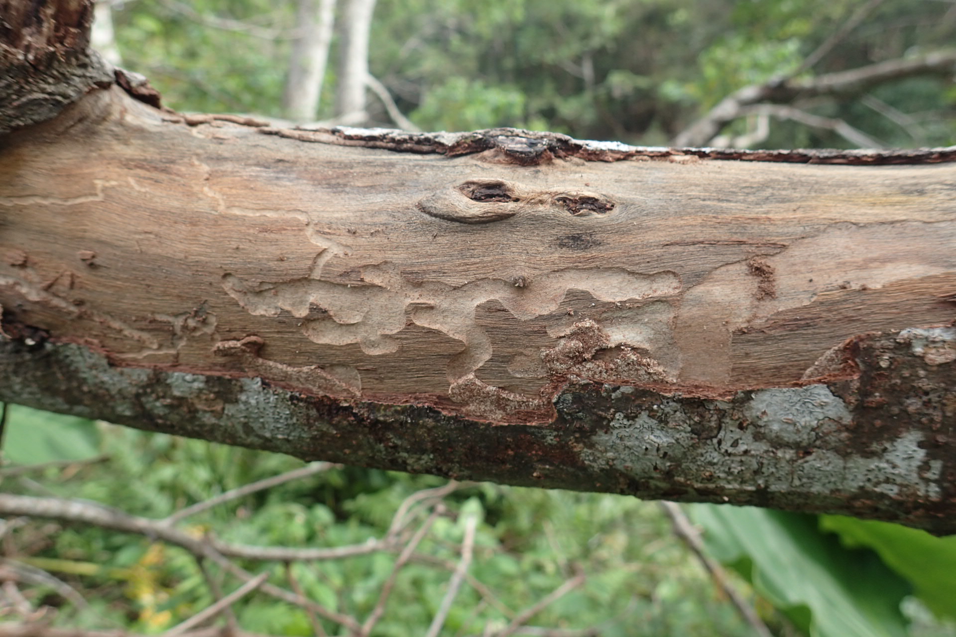 これはミズキ大木から枯れ落ちた小枝。樹皮下の食痕はクロキモンあたりでしょう。