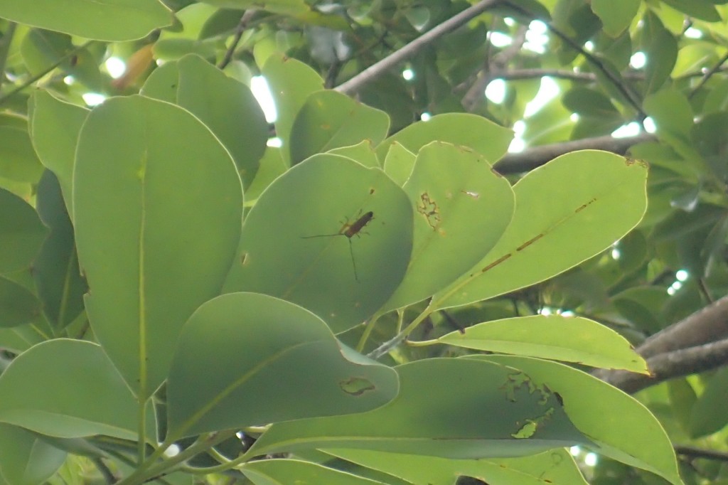 ビーティングに疲れてふと上を見上げると、タブの葉裏に付いていたイシガキリンゴカミキリ。