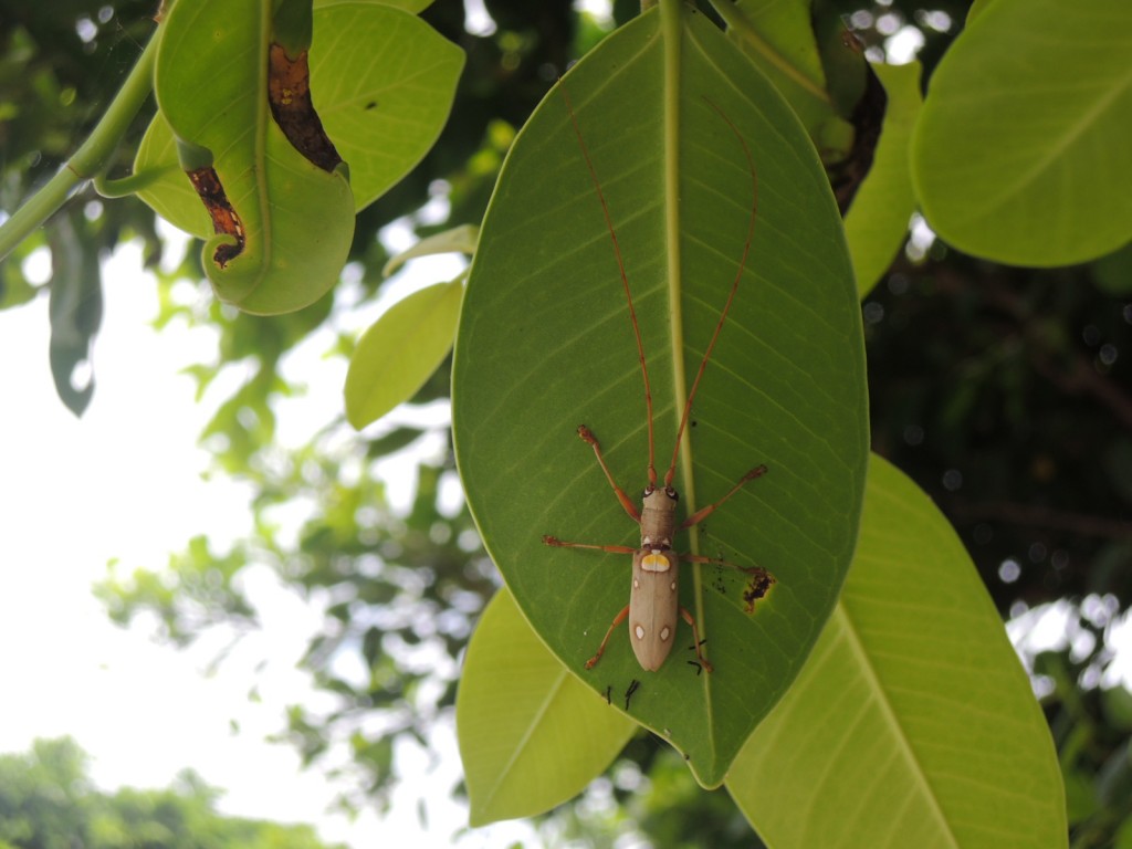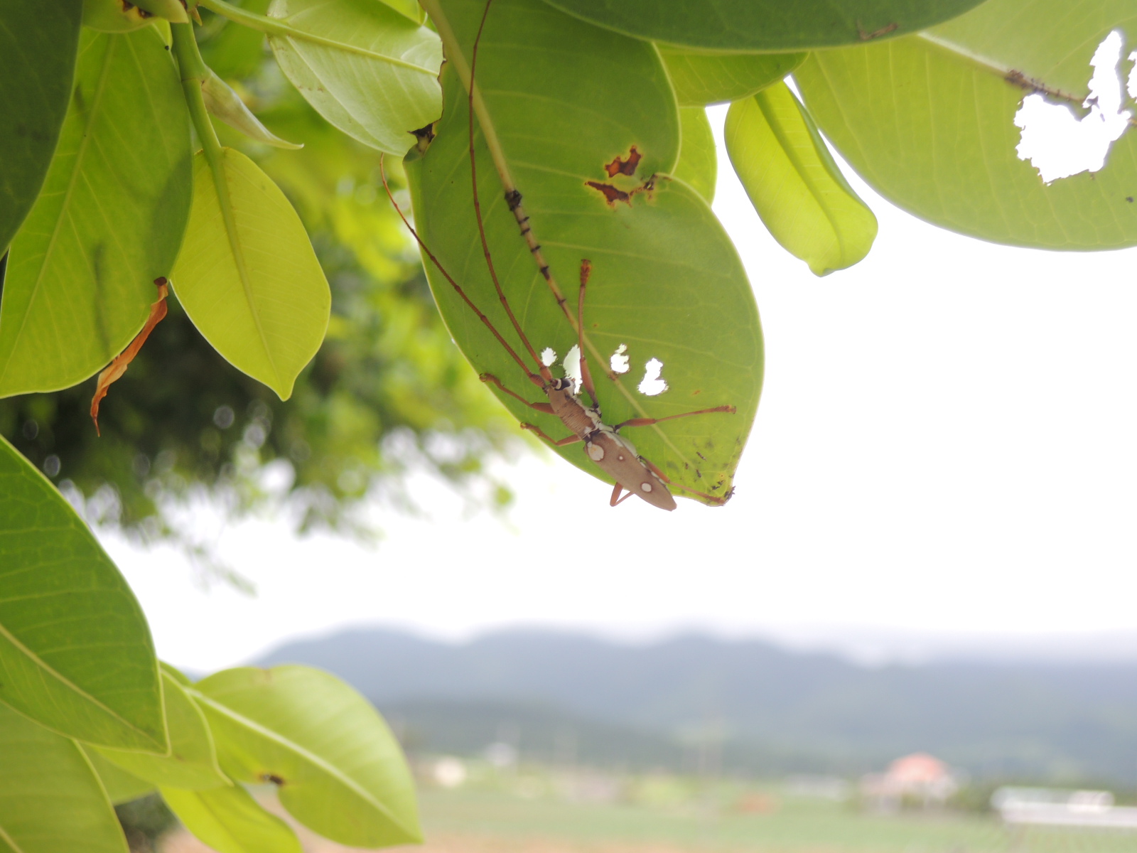 田園風景をバックにガジュマルの葉っぱを齧るイツホシシロカミキリ。