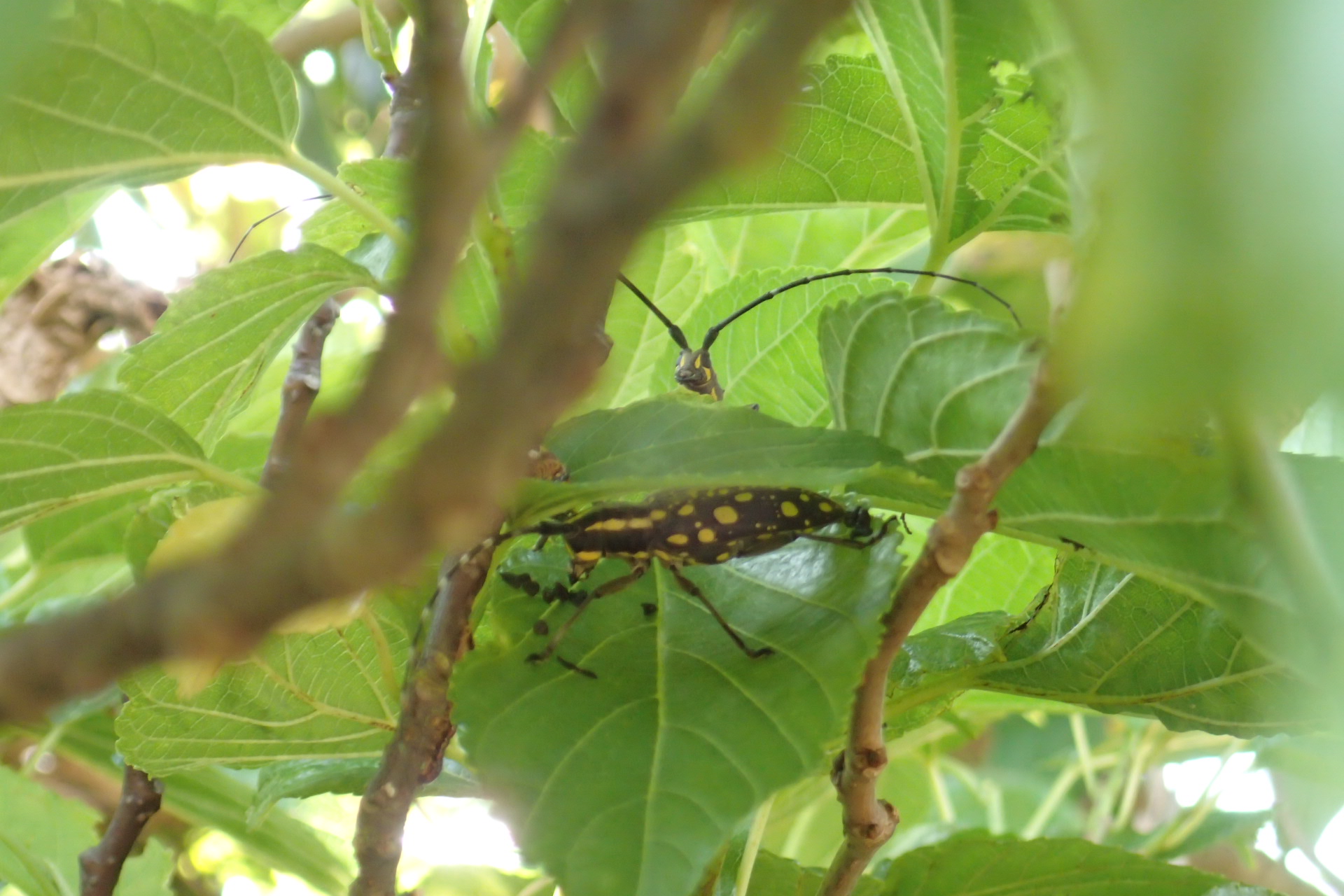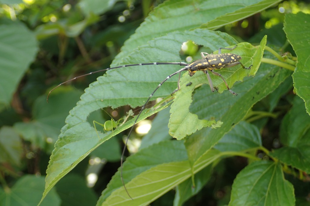 そして同様にクワ科樹木の葉に不定形の穴を開けながら後食するのがイツホシシロカミキリ。