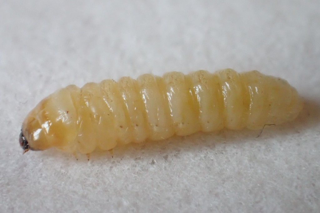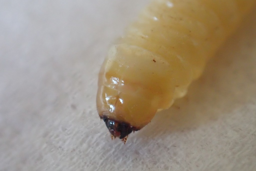 ハナカミキリの幼虫なので、アンヨが三対しっかり付いているのが分かります。